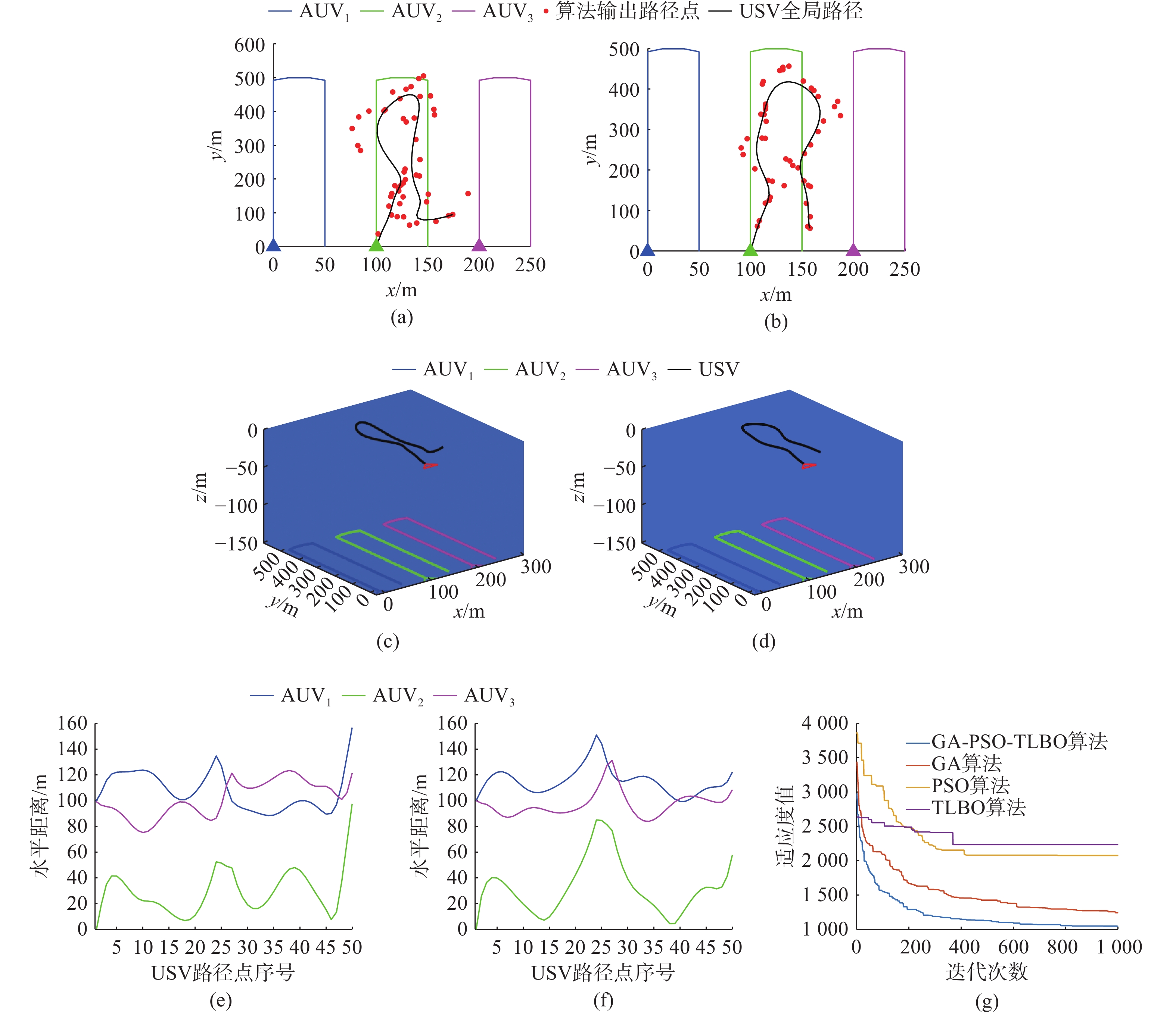 高速无人艇(USV)航向控制中, 同时存在前向通道与反馈回路的时滞环节, 并且具有较大的延迟/动态时间比, 显著降低航向控制性能。传统Smith预估器虽能有效补偿前向通道时滞, 但未考虑反馈回路的时滞。为此, 文中将反馈回路时滞纳入Smith预估器设计, 构建包含双向时滞的预测模型, 同时补偿前向通道与反馈回路的时滞, 减少双向时滞的系统相位裕度侵蚀。进一步, 引入混合均值中心反向学习粒子群优化(HCOPSO)算法进行比例-积分-微分(PID)控制器参数寻优整定, 该算法在迭代前期利用均值中心反向学习策略扩大搜索范围, 后期通过自适应压缩因子实现精细寻优, 兼具全局探索与局部开发的优势, 有效解决寻优过程的局部最优解问题。基于USV航向模型进行了仿真测试, 结果表明, 改进Smith预估PID控制器相较于常规PID控制器、传统Smith预估PID控制器, 系统的超调量和调节时间均得到了改善, 稳态误差小于0.1°; 并且当改进Smith预估补偿模型存在误差时, 系统依然能够保持良好的动态性能与稳态精度。同时, 针对改进Smith预估PID控制器, 进一步对比分析了HCOPSO算法与粒子群优化(PSO)算法、遗传算法(GA)和鲸鱼优化算法(WOA)的航向控制性能。结果表明, HCOPSO算法获得的时间加权绝对误差积分(ITAE)指标较PSO、GA和WOA算法分别降低了55.38%、22.47%和24.63%, 并表现出较强的扰动抑制能力与航向保持能力, 验证了其有效性。