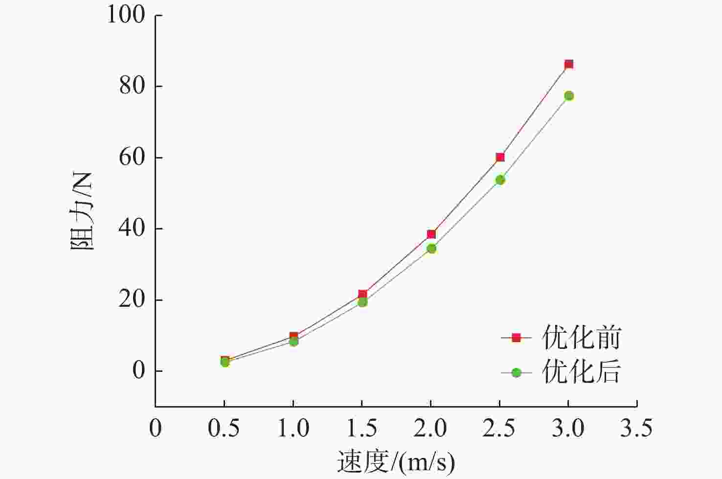 速度/(m/s) 总阻力/N 优化前 优化后 0.5 2.887 2.436 1.0 9.664 8.178 1.5 21.593 19.344 2.0 38.451 34.436 2.5 60.003 53.748 3.0 86.364 77.341 表 4 优化前后斜航运动仿真结果对比
