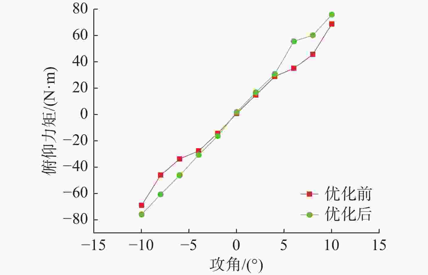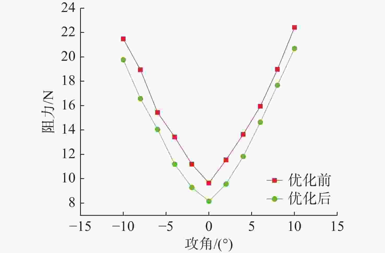 攻角/(°) 总阻力/N 俯仰力矩/(N·m) 优化前 优化后 优化前 优化后 10 22.459 20.726 68.785 75.912 8 19.009 17.714 45.567 60.053 6 15.981 14.673 34.867 55.504 4 13.681 11.867 28.732 30.607 2 11.583 9.586 14.737 16.685 0 9.664 8.178 0.5674 1.703 −2 11.232 9.301 −14.429 −16.609 −4 13.461 11.235 −27.862 −30.873 −6 15.471 14.089 −33.941 −46.499 −8 18.972 16.611 −46.335 −60.873 −10 21.507 19.802 −69.227 −76.225 -