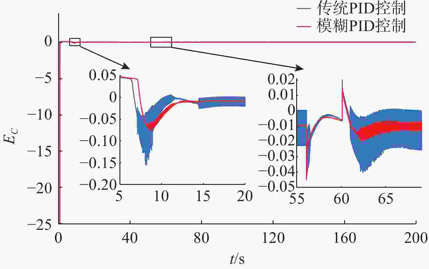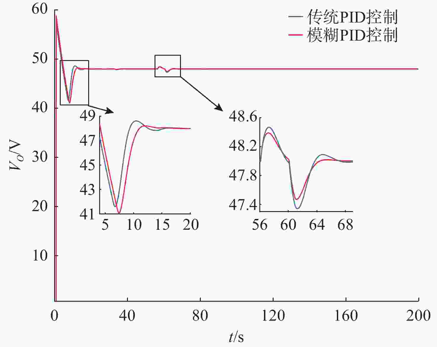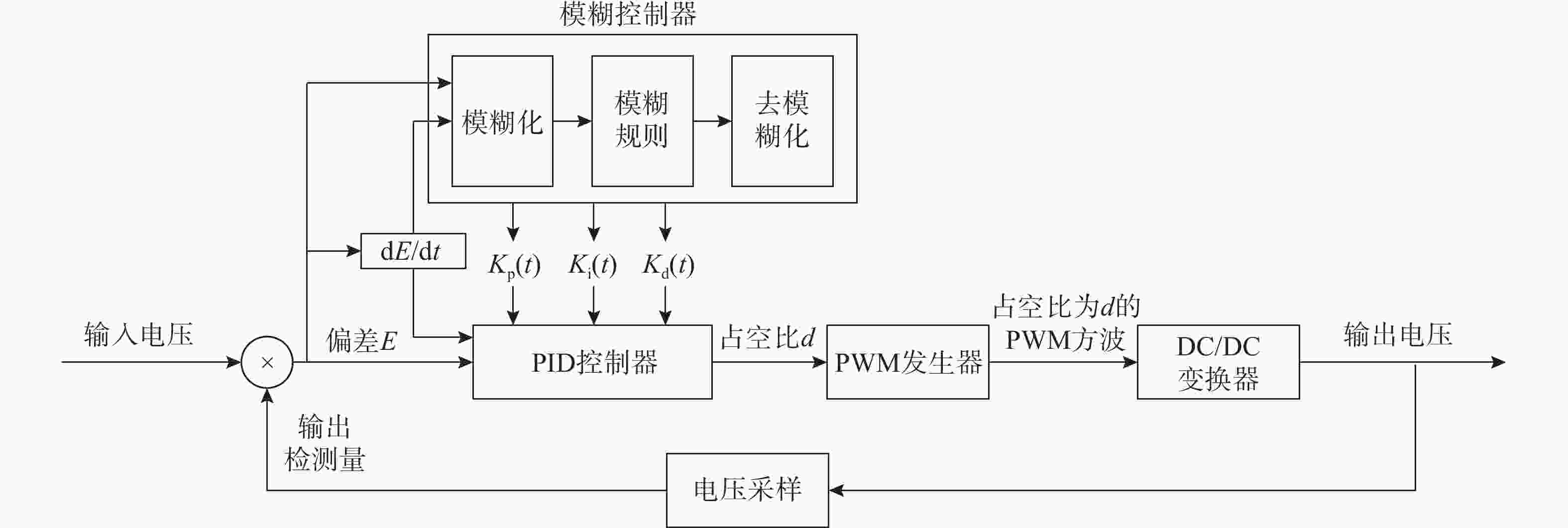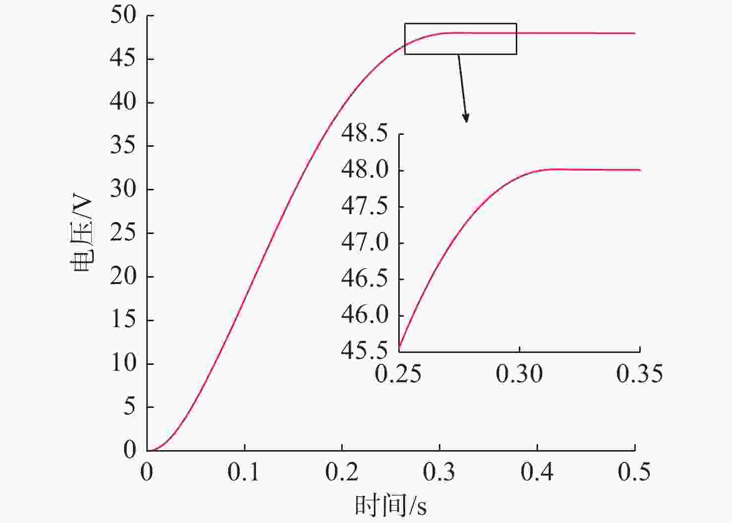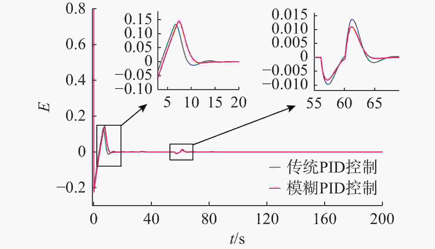 摘要: 针对水下无人动力平台对高效、稳定能源系统的需求, 文中聚焦质子交换膜燃料电池(PEMFC)输出电压强非线性、易波动的难题, 提出一种基于模糊比例-积分-微分(PID)自适应控制的DC-DC变换器稳压策略。PEMFC输出电压因强非线性特性且易波动, 传统控制方法在动态响应与鲁棒性方面存在局限。为此, 建立了含能斯特电压及活化、欧姆、浓差损失的PEMFC数学模型, 以及Boost升压电路模型, 剖析其电压波动机理; 设计了一种模糊PID控制器, 其规则库深度耦合PID控制原理与PEMFC非线性特性, 实现了PID参数的在线动态自整定, 从而实时优化DC-DC变换器占空比。仿真结果表明: 相较于传统PID控制, 模糊PID控制可缩短系统调节时间, 使稳态误差趋近于零, 在电流突变工况下输出电压波动范围缩小至±0.5 V以内, 且占空比响应更精准。该模糊PID自适应策略显著增强了系统的动态响应速度与鲁棒性, 为水下无人平台能源系统的高效、稳定运行提供了可靠的理论支撑与解决方案。Abstract: Aiming at the demand of underwater unmanned power platform for an efficient and stable energy system, this paper focused on the problem of strong nonlinearity and easy fluctuation of the output voltage of proton exchange membrane fuel cell(PEMFC) and proposed a DC-DC converter voltage stabilization strategy based on the fuzzy proportional-integral-derivative(PID) adaptive control. Due to the strong nonlinear characteristics of the output voltage of the PEMFC and its fluctuation trend, the traditional control methods have limitations in the dynamic response and robustness. Therefore, a mathematical model of PEMFC, including Nernst voltage and activation, ohmic, and concentration loss and a Boost boost circuit model were established to analyze the voltage fluctuation mechanism. A fuzzy PID controller was designed, with a rule base that deeply coupled the PID control principle with the nonlinear characteristics of PEMFC, which realized the online dynamic self-tuning of PID parameters to optimize the duty cycle of the DC-DC converter in real time. The simulation results show that compared with the traditional PID control, the fuzzy PID control can shorten the system regulation time, and the steady-state error tends to be close to zero; the output voltage fluctuation range is narrowed to within ±0.5 V under the sudden current change condition, and the duty cycle response is more accurate. The fuzzy PID adaptive strategy significantly enhances the dynamic response speed and robustness of the system, providing a reliable theoretical cornerstone and solution for the efficient and stable operation of the energy system of the underwater unmanned platform.