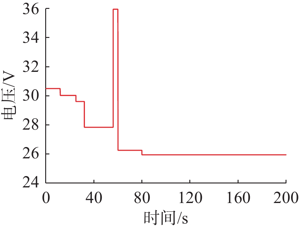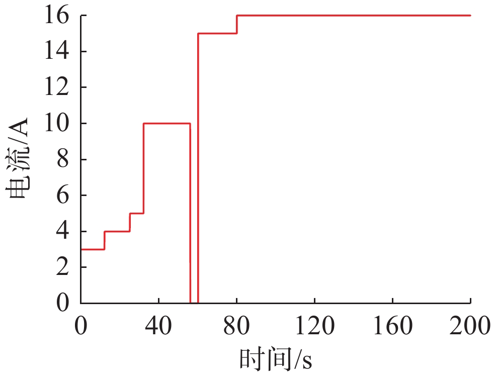 参数 值 参数 值 n/个 35 l/cm 0.04 T/K 323 A/cm2 60 PH2/atm 0.5 λ 20 PO2/atm 0.3 B 0.016 I/A 16 imax/ (A/cm2) 1.5 尺寸/mm3 104×67×120 Cst/[kJ/(kg·K)] 0.71 Mst/kg 1.08 理想工作温度/K 318.15~327.15 注: Mst为PEMFC的质量; Cst为PEMFC的比热容。 表 2 输入电流数据