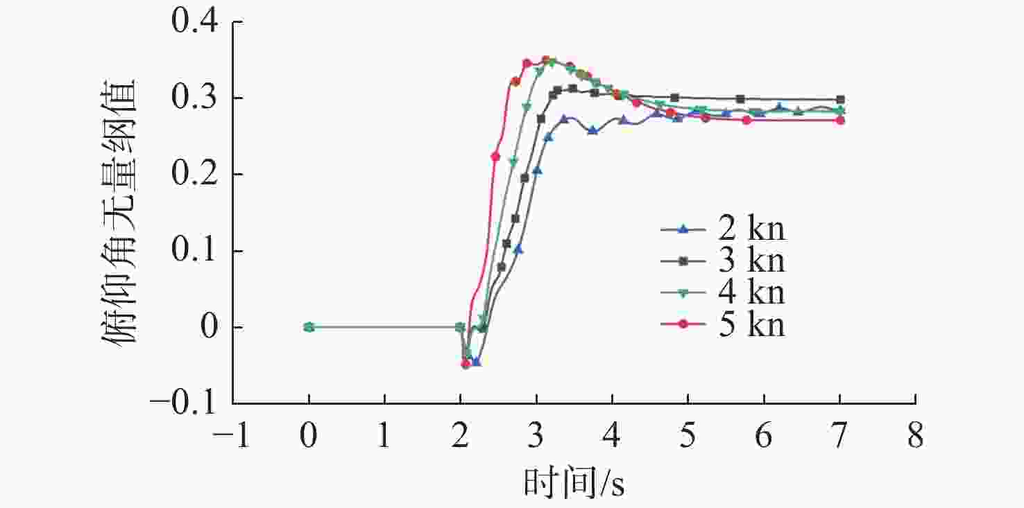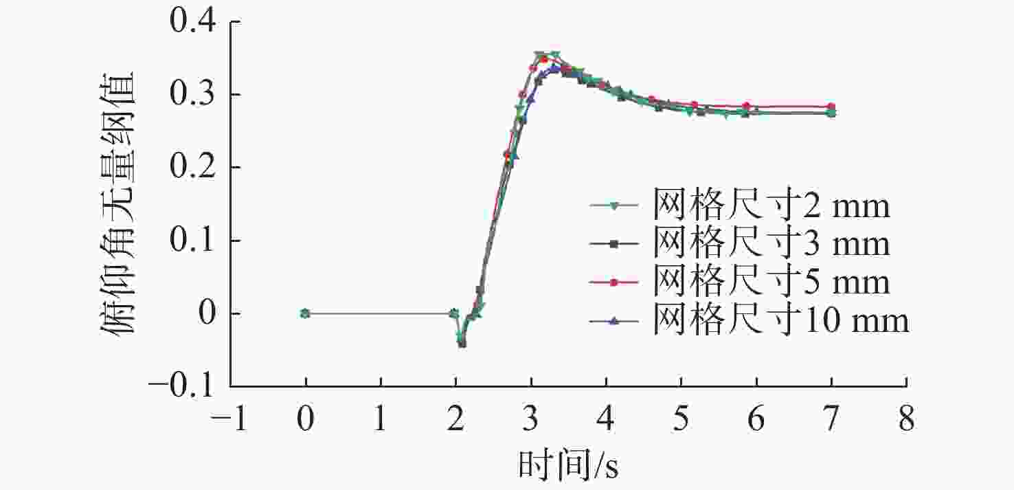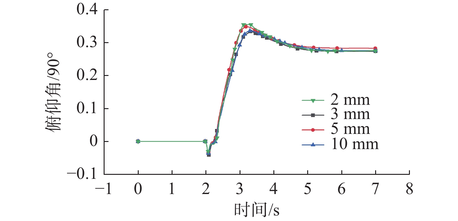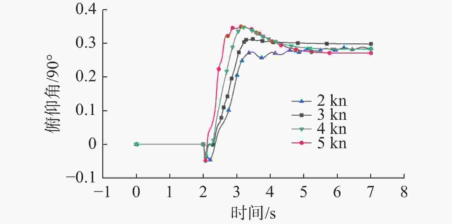 表面网格尺寸/mm 网格总数 水平阻力/N 竖直升力/N 10 188 975 33.77 21.36 5 283 445 34.21 21.19 3 986 964 32.79 22.00 2 1 902 176 32.96 21.84 表 3 4 kn航速下拖曳体俯仰角数值仿真误差