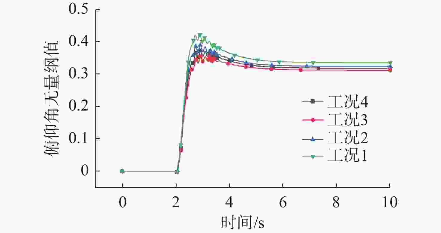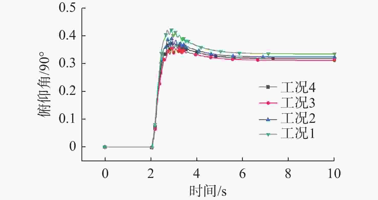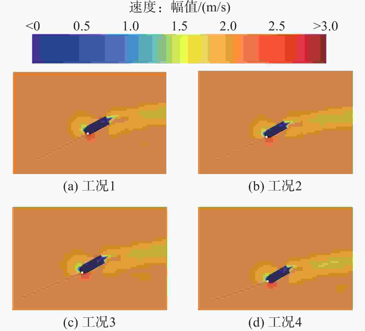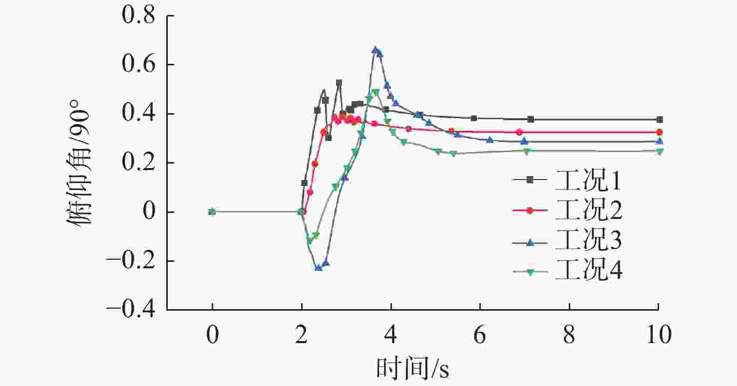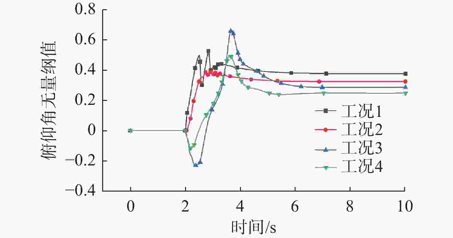 工况 重心横坐标/m $\Delta X/L$ 备注 1 0.043 8 0.08 重心位于浮心前方 2 −0.006 2 −0.01 重心与浮心基本重合 3 −0.056 2 −0.10 重心位于浮心后方 4 −0.106 2 −0.29 重心位于浮心后方, 且间距更大 表 5 改变拖曳点位置的不同工况参数
