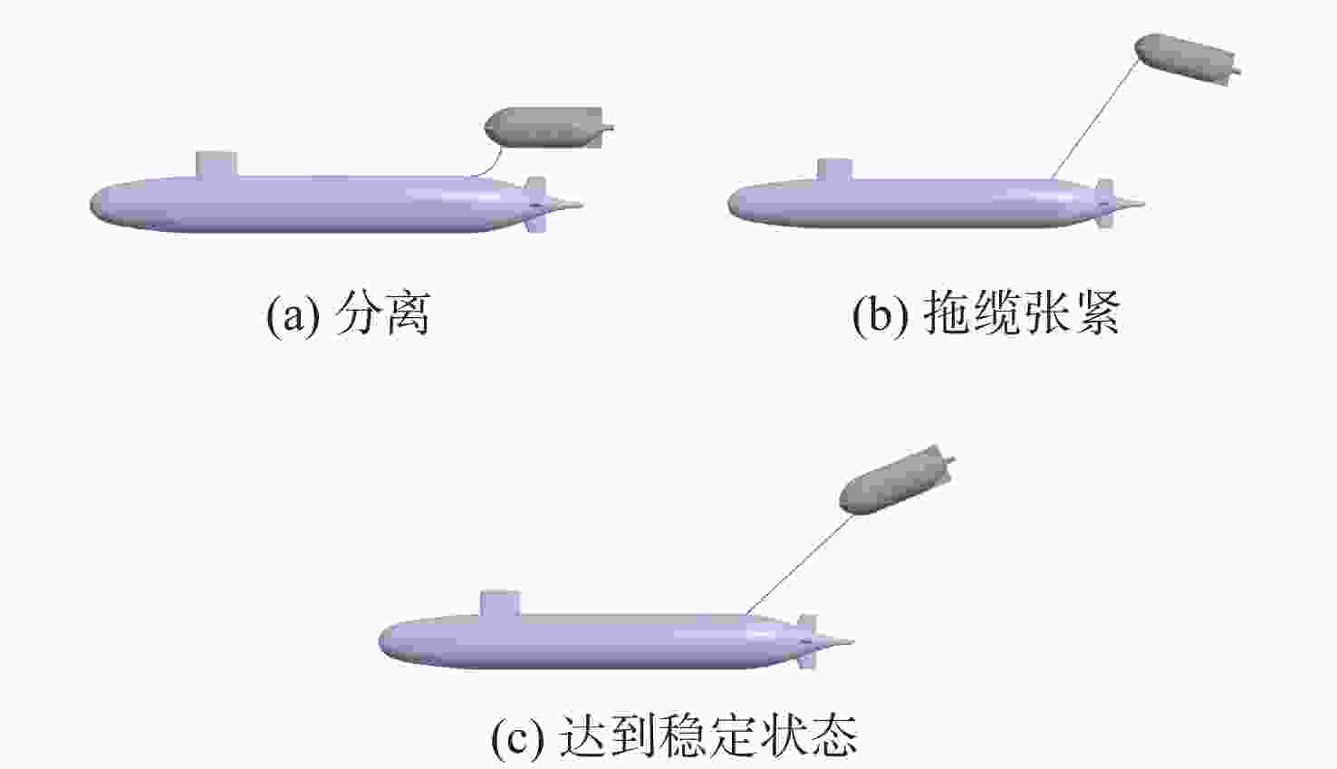 摘要: 水下拖曳体是水下航行器的重要部件, 为满足其拖缆设计及释放过程中姿态稳定的需求, 文中开展了相关研究。首先, 采用重叠网格技术与可实现的k-ε湍流模型, 构建拖曳体流体动力学模型, 并对其释放过程进行非定常数值仿真; 随后, 通过试验结果验证了网格划分与数值方法的有效性。在此基础上进一步系统分析了拖曳速度、重浮心位置以及拖曳点位置三大关键因素对水下拖曳体释放过程的影响规律, 仿真结果表明: 拖曳速度影响拖曳体的稳定时间与姿态稳定过程, 需根据拖曳体结构确定最佳拖曳速度; 重浮心位置对拖曳体释放动力学特性作用显著, 重心前移设计可减小拖曳体振荡、提升系统稳定性, 且重心与浮心接近时, 拖曳体姿态调整时间更短、运动更平稳; 拖曳点应选在拖曳体头部下方, 以减小释放过程中俯仰角的变化、提高释放稳定性。研究结果为水下拖曳体的工程设计与释放策略提供了重要理论依据。Abstract: The underwater towed body is an important component of underwater vehicles. For the requirements such as the design of the towing cable for underwater towed bodies and stable attitude during the release process, this paper constructed the fluid dynamics model of the towed body by the overlapping mesh technology and the achievable k-ε turbulence model. It also carried out the unsteady numerical simulation of the release process. After the simulation, the paper verified the effectiveness of the grid division and numerical methods through the experimental results. The paper systematically analyzed the influence of towing speed, the position of the barycenter and the buoyant center, and the towing point on the release process of the underwater towed body. The simulation results show that towing speed affects the stabilization time and attitude stabilization process of the towed body, and the optimal towing speed needs to be determined according to the structure of the towed body. The positions of the barycenter and the buoyant center have a significant effect on the release dynamic characteristics of the towed body, and the design of moving the barycenter forward can reduce the oscillation of the towed body and improve the stability of the system. When the barycenter is close to the buoyant center, the attitude adjustment time of the towed body is shorter, and the movement is more stable. The towing point should be under the head of the towed body to reduce the change in pitch angle during the release process and improve the stability of the release process. The results provide an important theoretical basis for the engineering design and release strategy of underwater towed bodies.