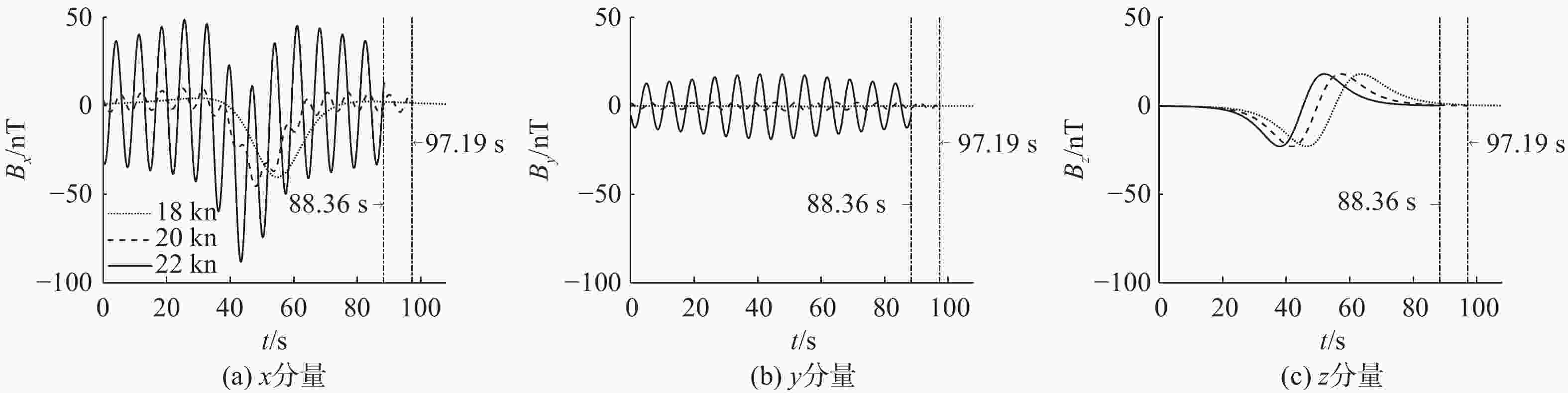 航行速度/kn $\max \left| {{B_x}} \right|$/nT $\max \left| {{B_y}} \right|$/nT $\max \left| {{B_{\textit{z}}}} \right|$/nT 22.0 74.58 18.90 18.07 21.5 63.43 12.88 18.07 21.0 54.69 8.20 18.07 20.5 48.44 4.88 18.07 20.0 44.37 2.73 18.07 19.5 41.99 1.48 18.07 19.0 40.74 0.84 18.07 18.5 40.30 0.55 18.07 18.0 40.25 0.47 18.07 表 3 不同潜深时目标综合磁场矢量场最大幅值