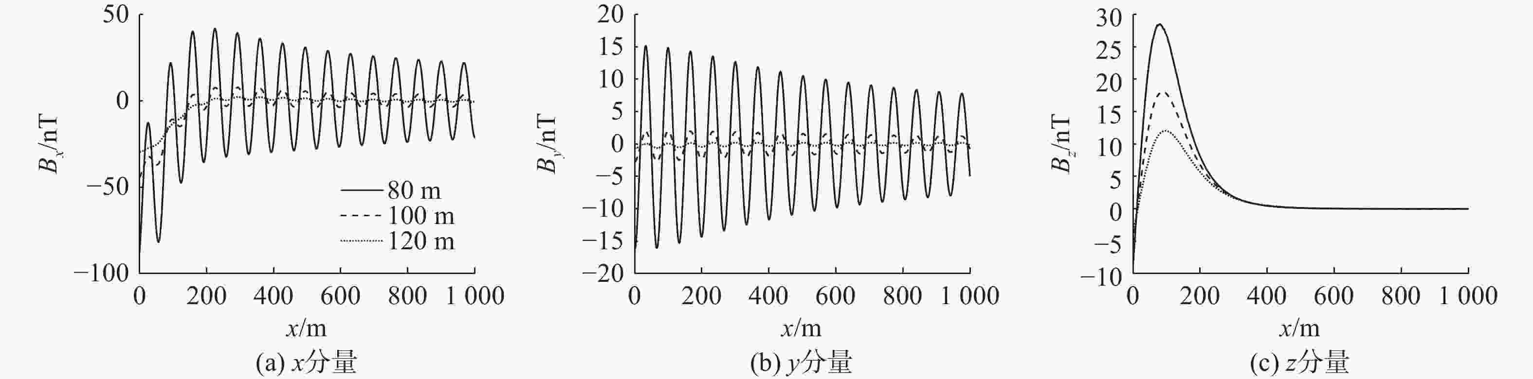 下潜深度/m $\max \left| {{B_x}} \right|$/nT $\max \left| {{B_y}} \right|$/nT $\max \left| {{B_{\textit{z}}}} \right|$/nT 80 87.70 16.23 28.54 85 70.88 10.30 25.44 90 59.16 6.45 22.60 95 50.81 4.23 20.16 100 44.37 2.73 18.06 105 39.40 1.75 16.23 110 35.52 1.20 14.71 115 32.29 0.81 13.29 120 29.60 0.65 12.04 -