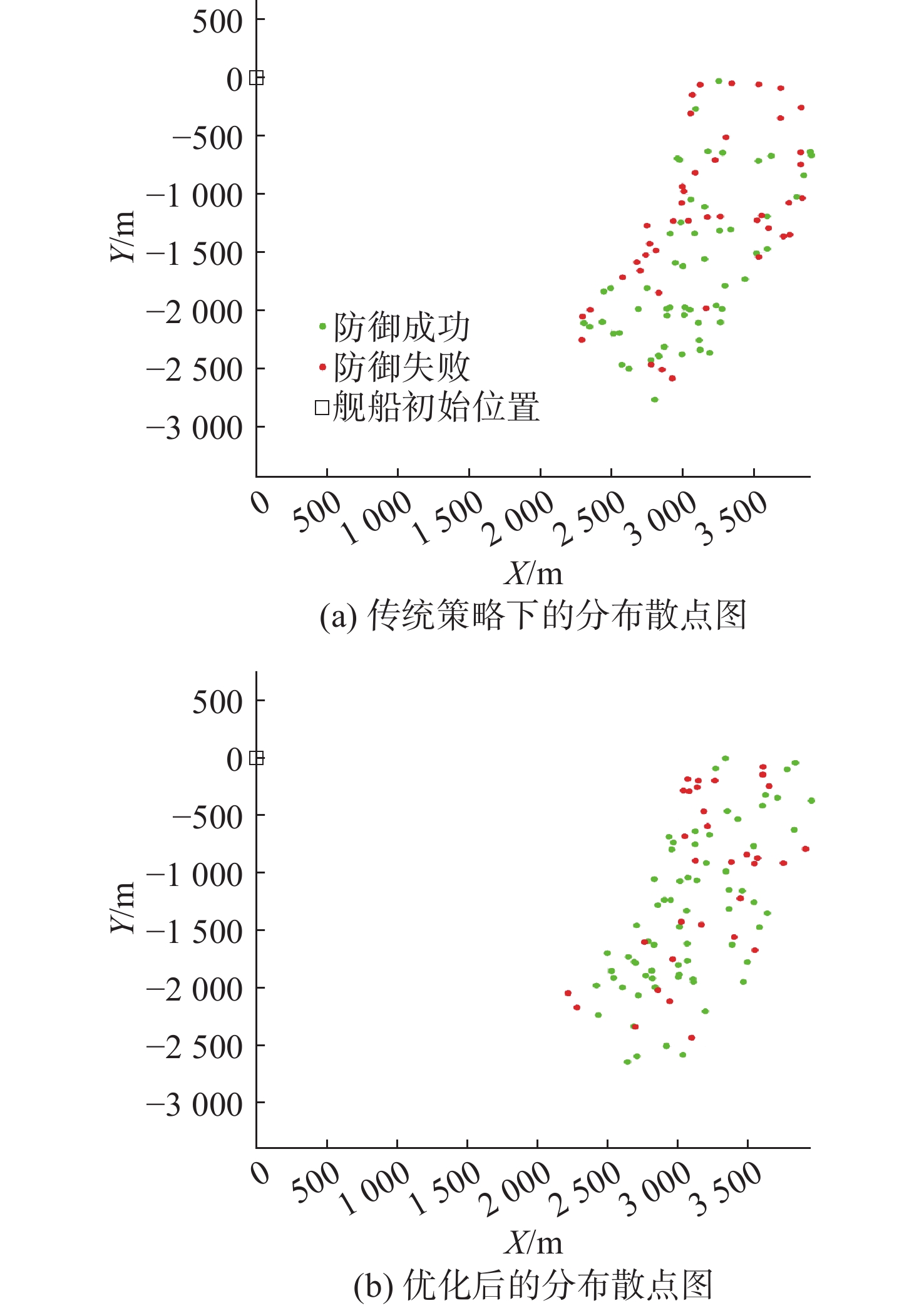 策略参数 数值 优化前 优化后 舰艇规避航向/(°) 95.2 70.8 第1枚诱骗装置释放距离/m 1 998.4 1 687.1 第1枚诱骗装置释放方位/(°) −85.6 −53.1 第2枚诱骗装置释放距离/m 1 494.9 2 157.6 第2枚诱骗装置释放方位/(°) −75.7 −28.9 表 4 小舷角态势优化前后策略参数