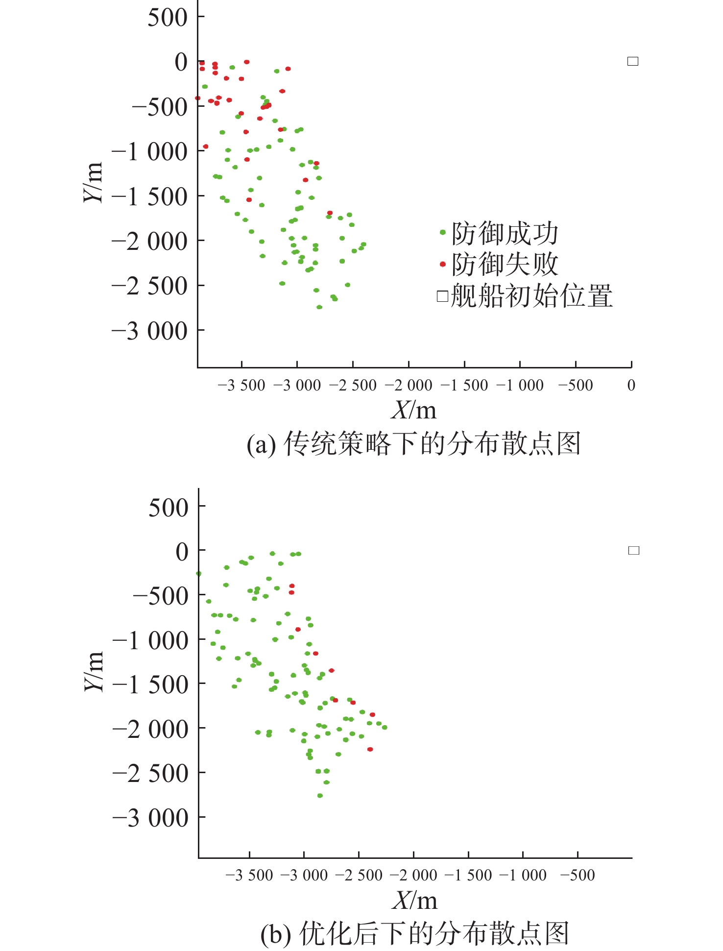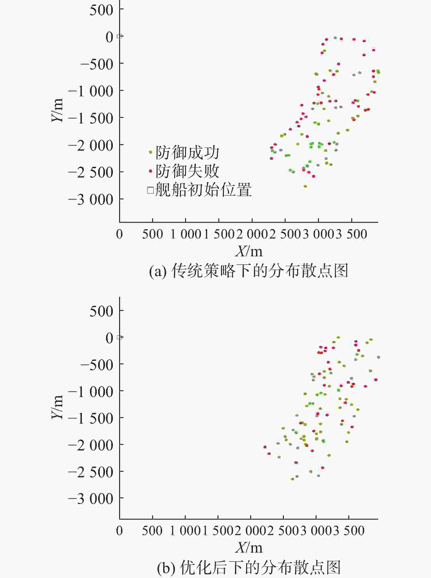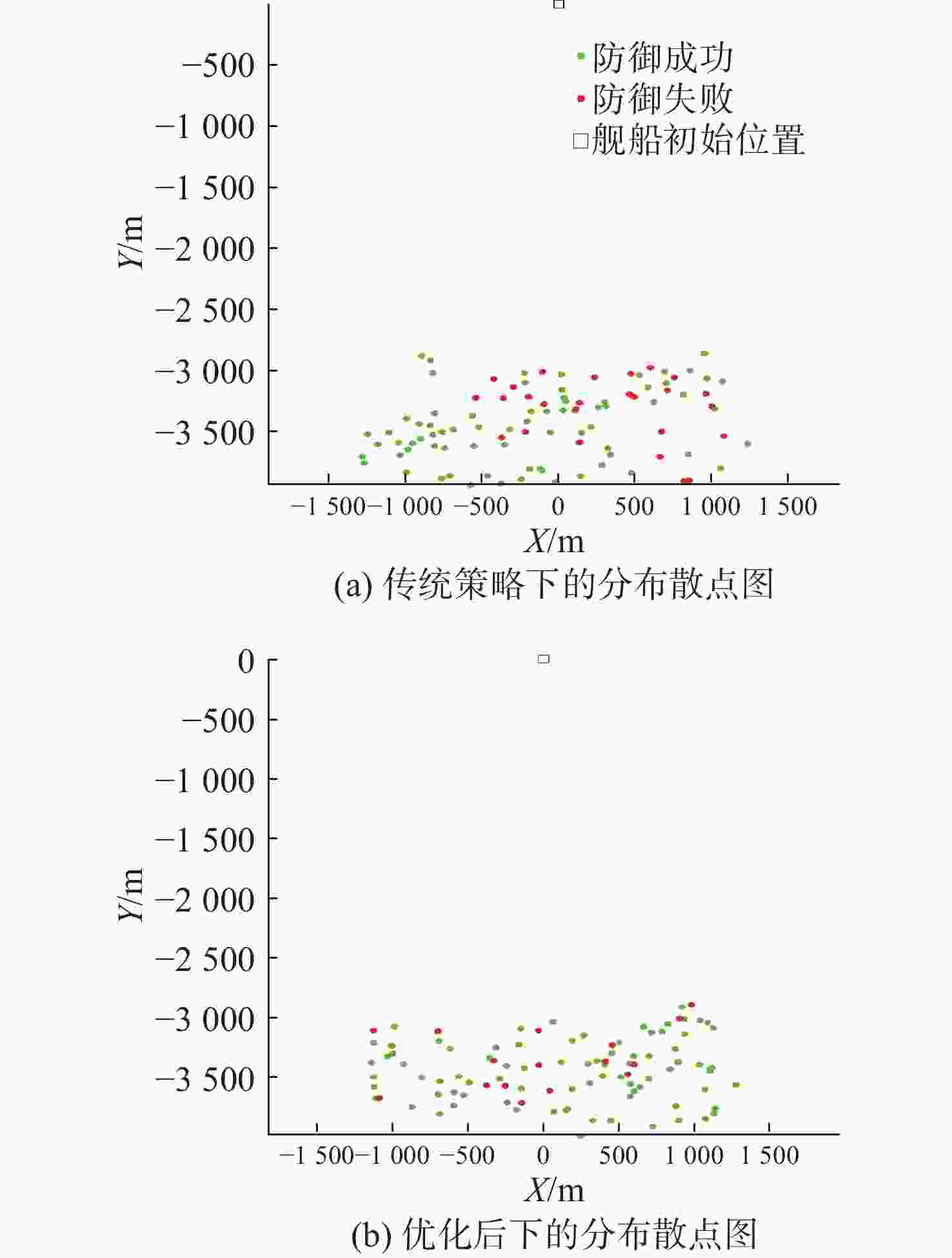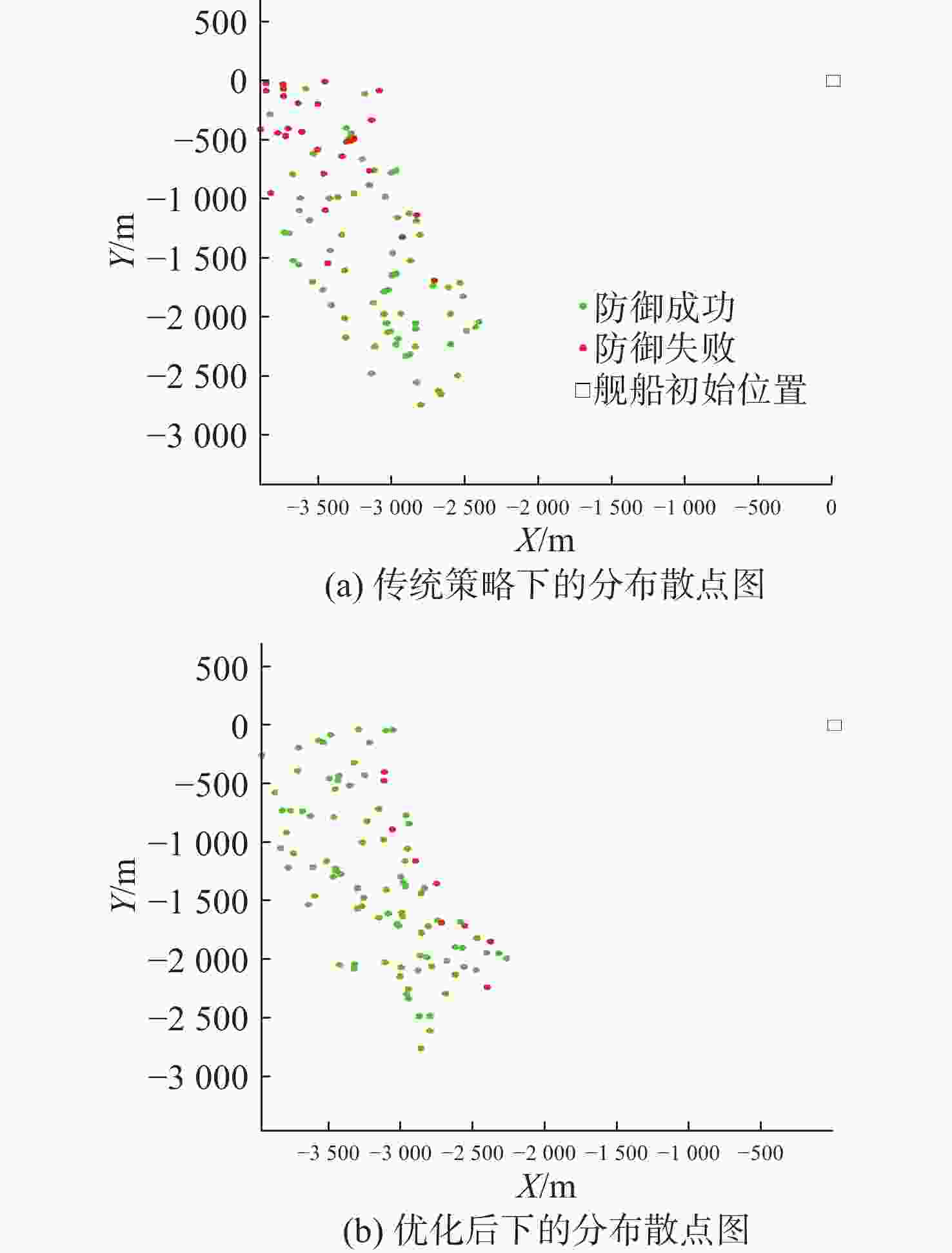 策略参数 优化前 优化后 舰艇规避航向 95.2° 70.8° 第1枚诱骗装置释放距离 1 998.4 m 1 687.1 m 第1枚诱骗装置释放方位 −85.6° −53.1° 第2枚诱骗装置释放距离 1 494.9 m 2 157.6 m 第2枚诱骗装置释放方位 −75.7° −28.9° 表 4 小舷角态势优化前后的策略参数