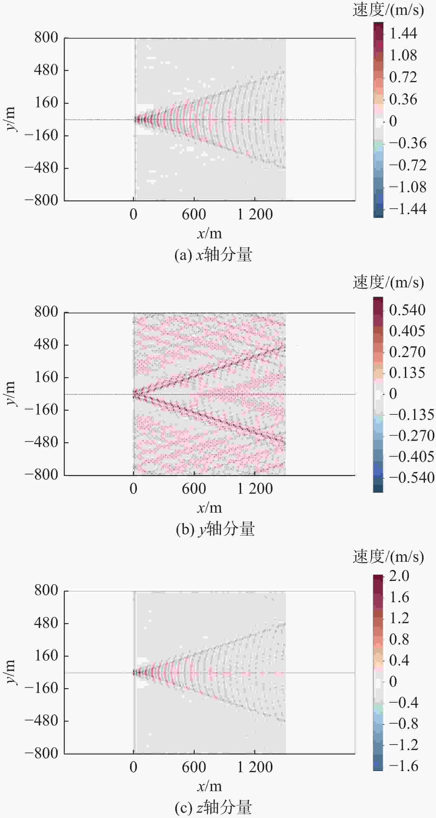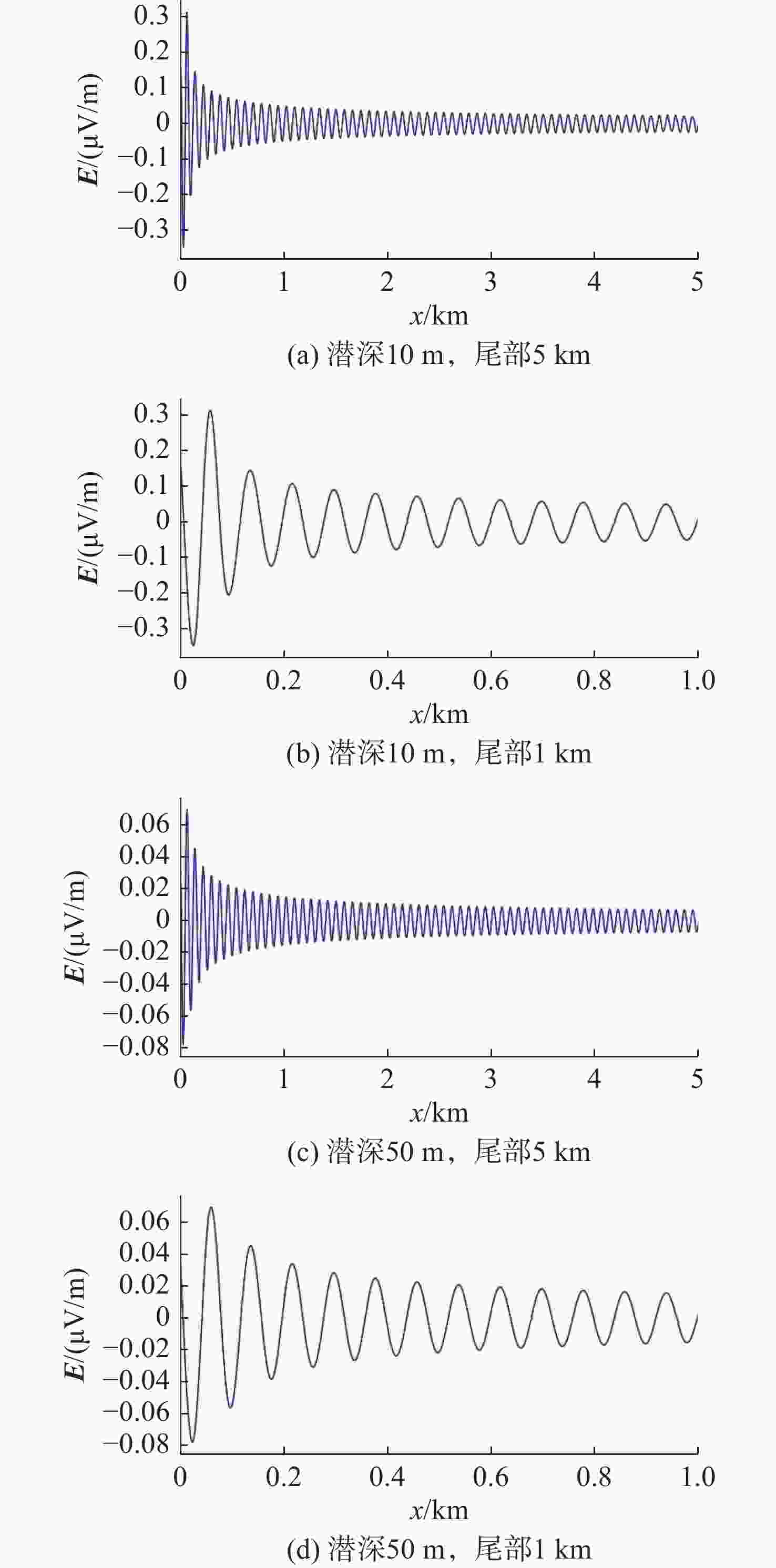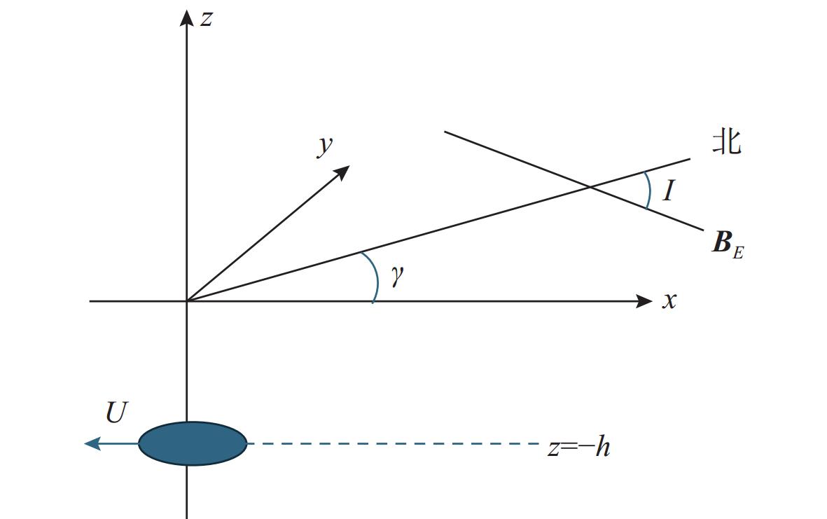 摘要: 水下航行器尾流切割地磁场产生的感应电磁场为其非声学探测提供了新途径。然而, 现有研究多集中于水面舰船或有限水深环境, 且未能深入揭示下潜深度在无限深水域中对尾流电磁场的调控规律。针对此问题, 文中基于麦克斯韦方程组和流体力学基本理论, 利用水下航行器尾流感应电磁场的数学模型进行数值仿真, 并重点对比分析了下潜10 m与50 m 2种典型深度下的场分布特征。结果表明: 当水下航行器运动时, 其尾流速度场分布呈典型V字形分布, 尾流感应电磁场沿航迹呈指数衰减; 随着下潜深度增加, 感应磁场峰值显著减弱(从0.3 nT降至0.1 nT), 感应电场峰值增强(从1 μV/m增至3 μV/m)。文中研究从理论与仿真层面揭示了下潜深度对电磁场的影响规律, 证实了针对不同潜深目标需采用差异化探测策略的可行性, 为深海目标探测提供了新的理论依据。Abstract: The induced electromagnetic field generated by the undersea vehicle wake cutting through the geomagnetic field provides a new approach for the non-acoustic detection. However, existing research has primarily focused on surface ships or environments with finite water depth and has not thoroughly revealed the influence law of submersion depth on the wake’s electromagnetic field in infinitely deep waters. To address this issue, this study employed numerical simulations based on Maxwell’s equations and fundamental hydrodynamic theories, utilizing a mathematical model of the induced electromagnetic field in the undersea vehicle wake. The distribution characteristics of the field at two typical depths, namely 10 m and 50 m, were specifically compared and analyzed. The results indicate that when the underwater vehicle is sailing, its wake velocity field exhibits a typical V-shaped distribution. The induced electromagnetic field of the wake decays exponentially along the trajectory. As the submersion depth increases, the peak induced magnetic field strength significantly decreases (from 0.3 nT to 0.1 nT), while the peak induced electric field strength increases(from 1 μV/m to 3 μV/m). This study elucidates the influence of submersion depth on the electromagnetic field through theory and simulation, confirms the feasibility of adopting differentiated detection strategies for targets at different depths, and provides a new theoretical basis for deep-sea target detection.