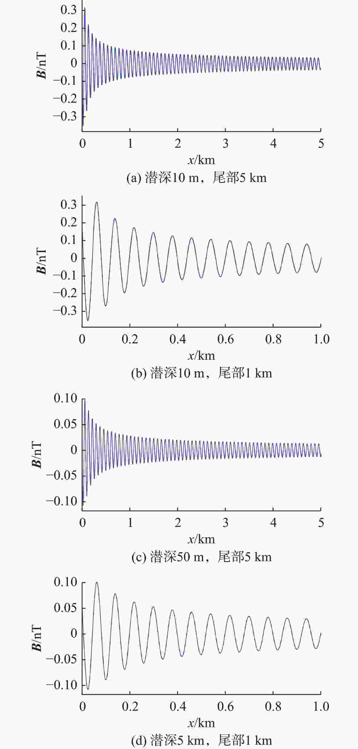 参数 数值 航行器长度/m 100 航行器速度/(m/s) 10 航行器模型半径/m 20 海水电导率/(S/m) 5 地磁恒定强度/nT 50 000 γ/(°) 0 I/(°) 60 -