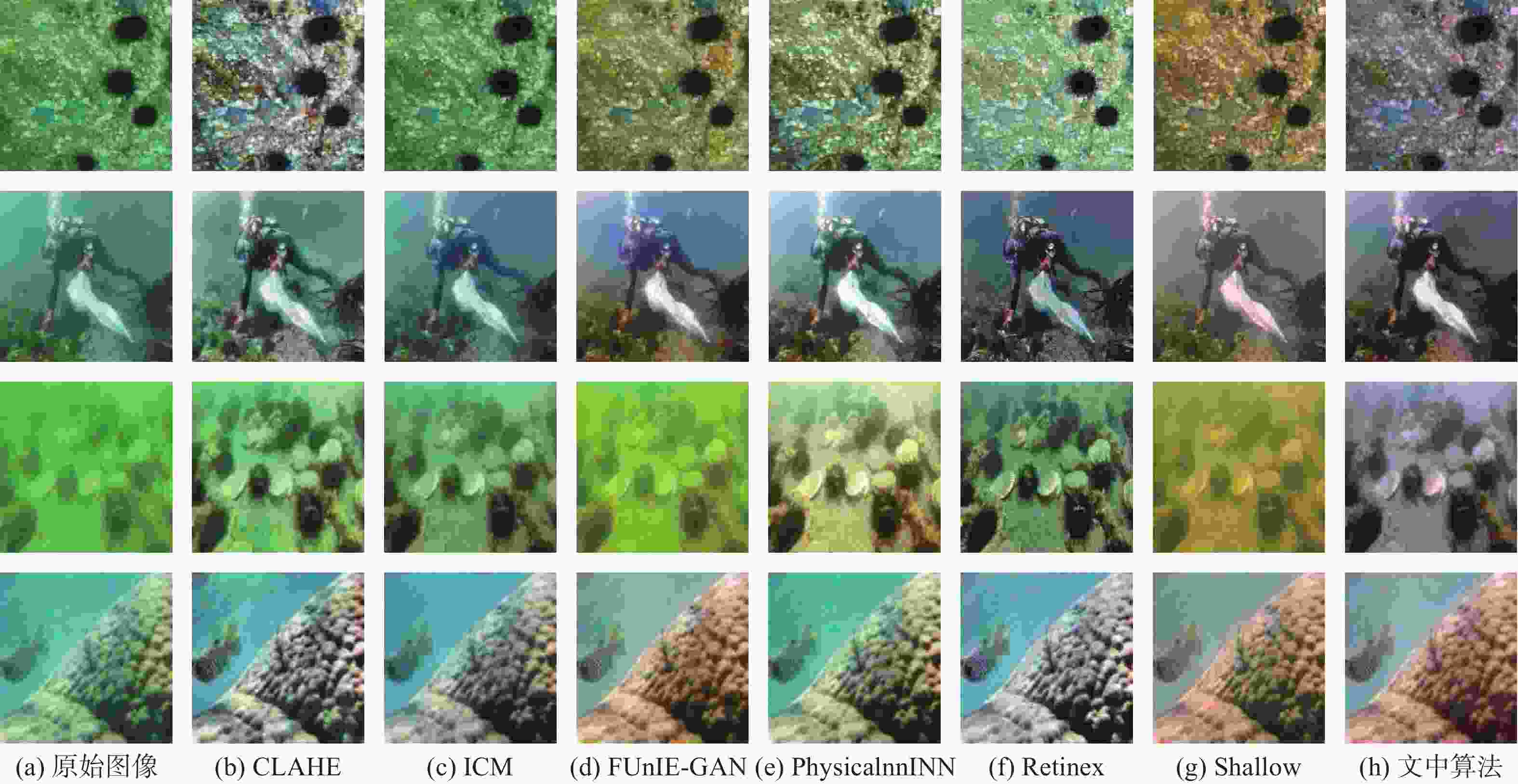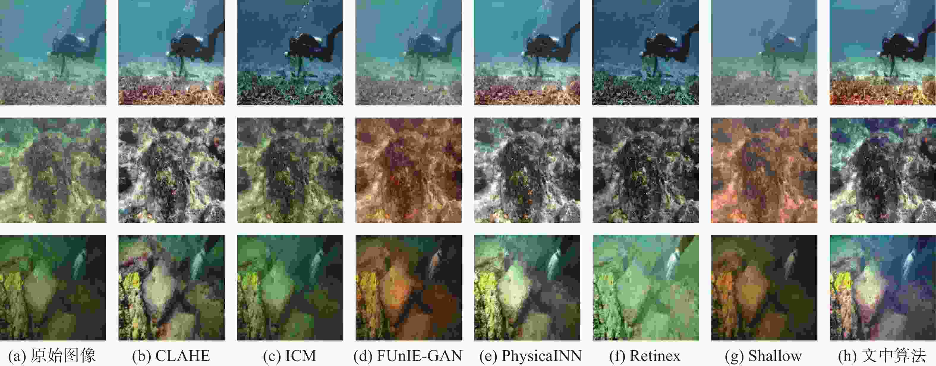 算法 UIQM UCIQE PSNR SSIM CLAHE 3.95 0.59 16.67 0.59 ICM 3.22 0.48 15.84 0.53 FUnIE-GAN 3.87 0.50 18.28 0.64 PhysicalNN 4.31 0.54 21.25 0.72 Retinex 4.08 0.53 19.75 0.61 Shallow 4.02 0.49 18.05 0.65 文中 4.33 0.63 25.84 0.87 -