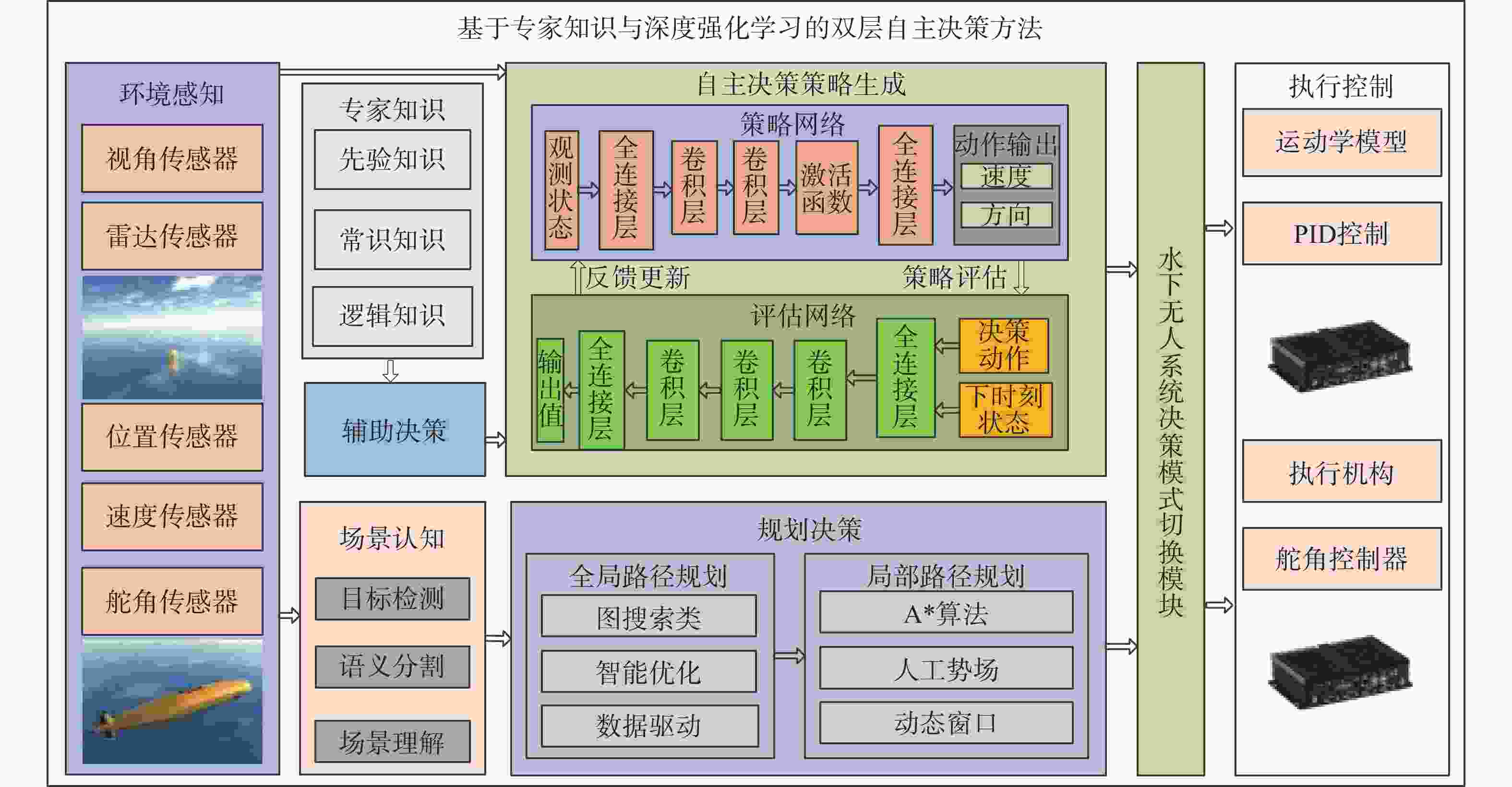摘要: 水下环境复杂多变, 水下无人系统面临不可预测性与感知信息不完备的挑战, 难以精准高效自主决策。传统方法依赖完备的感知数据与地图信息, 但受地图信息限制, 水下无人系统执行水下探测、资源勘探及环境监测等任务自主能力受限。针对此, 文中提出一种基于专家知识与深度强化学习的双层决策方法, 可提升无人系统在水下智能决策中的自适应能力, 增强任务执行的高效性。具体而言, 首先设计双层自主决策方法架构, 通过增强系统的鲁棒性, 以切实保障航行安全; 然后, 提出基于专家知识与深度强化学习的自主决策策略生成方法, 提升水下无人系统在未知场景中的自适应能力; 最后, 提出多模块设计方法, 达成各功能模块的解耦, 有效提升水下无人系统的研发效率。以水下无人系统为研究对象, 实验结果表明, 文中方法在水下无人系统自主导航及避障仿真场景中, 其成功率与平均奖励值收敛速度均优于各类基准方法, 为真实场景下的自主决策优化研究提供了坚实的理论支撑。Abstract: Due to the complex and dynamic underwater environment, underwater unmanned systems face challenges of unpredictability and incomplete perception, which makes it difficult for them to accurately and efficiently accomplish autonomous decision - making tasks. Traditional methods highly rely on complete perception data and map information. However, limited by the dynamic characteristics of the underwater environment, it is difficult to construct effective map information in real - time, thus leading to limited efficiency of underwater unmanned systems in executing tasks such as underwater detection, resource exploration, and environmental monitoring. To address the above challenges, this paper proposes a double-layer decision-making method based on expert knowledge and deep reinforcement learning. This method can effectively enhance the adaptive ability of unmanned systems in underwater intelligent decision-making and significantly improve the efficiency of task execution. Specifically, an autonomous decision-making strategy generation method is first proposed to enhance the adaptive ability of underwater unmanned systems in unknown scenarios, further strengthening their autonomous decision-making level in complex environments. Secondly, a double-layer autonomous decision-making method is put forward. By enhancing the robustness of the system, it effectively ensures navigation safety. Finally, a multi - module design method is proposed to achieve the decoupling of each functional module, effectively improving the research and development efficiency of underwater unmanned systems. Taking the unmanned underwater vehicle (UUV) as the research object, experimental results show that the success rate and the convergence speed of the average reward value of the method in this paper outperform various benchmark methods in the simulation scenarios of UUV autonomous navigation and obstacle avoidance, providing a solid theoretical support for autonomous decision - making in real-world scenarios.