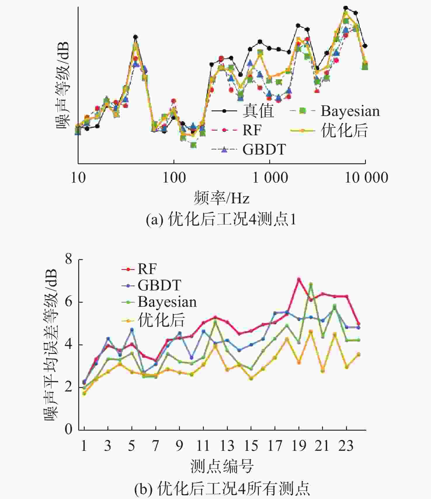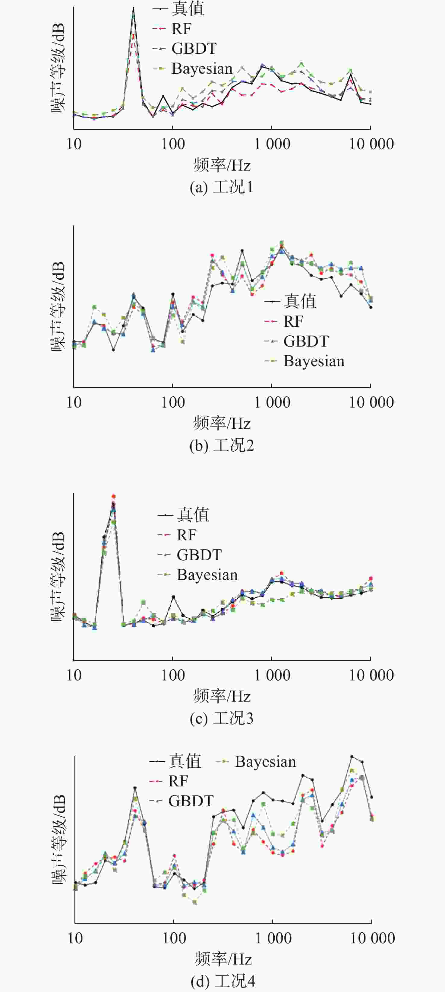 频域/ Hz RF GBDT Bayesian 10 ~100 2.49 2.21 2.56 100 ~ 1 000 2.83 2.53 2.76 1 000~10 000 2.12 2.31 3.33 表 3 不同工况下测点一模型预报误差比对