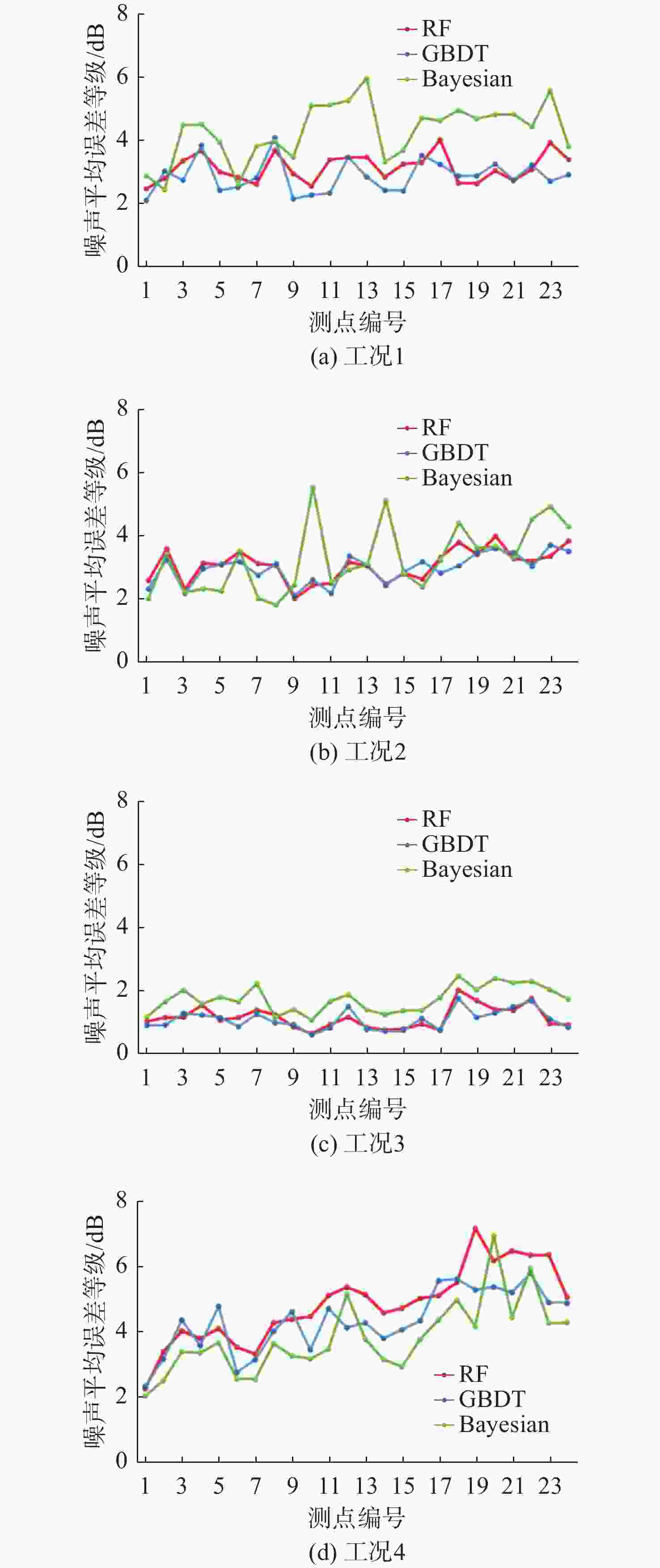 MAE/dB RMSE /dB 工况1 工况2 工况3 工况4 工况1 工况2 工况3 工况4 RF 3.2 3.0 1.2 4.8 3.2 3.1 1.2 4.9 GBDT 2.9 2.9 1.1 4.3 2.9 3.0 1.1 4.4 Bayesian 4.3 3.2 1.7 3.8 4.4 3.4 1.8 3.9 -