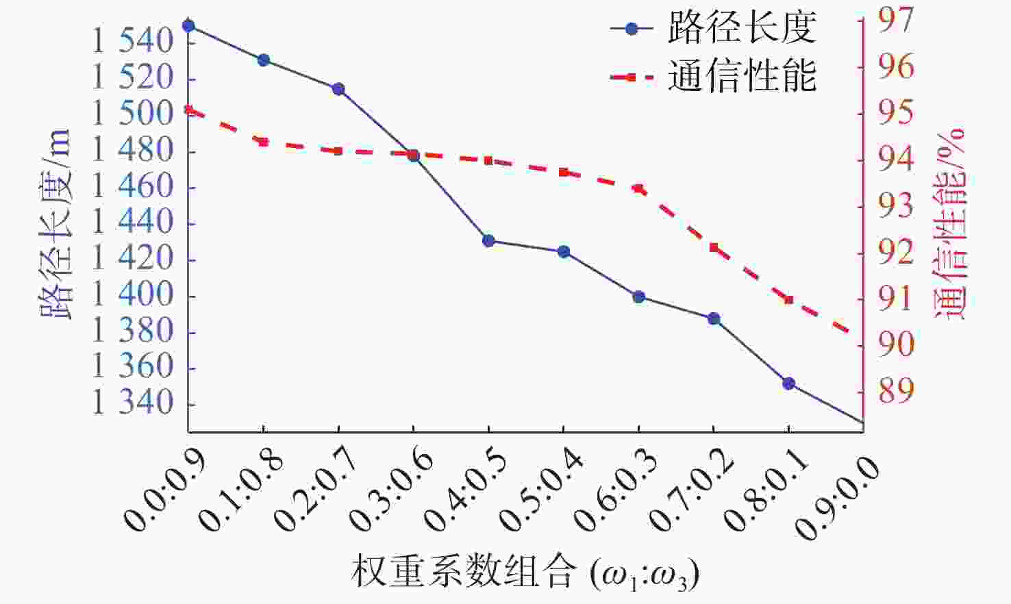 角/(°)100 1052 97.33 40.16 1052 97.33 40.40 150 1279 96.00 75.37 1130 96.67 75.20 200 1280 95.34 92.56 1203 96.33 66.07 250 1311 95.33 93.81 1211 95.50 103.60 300 1562 94.10 107.84 1431 94.40 103.53 表 2 不同稳定通信距离的路径规划结果