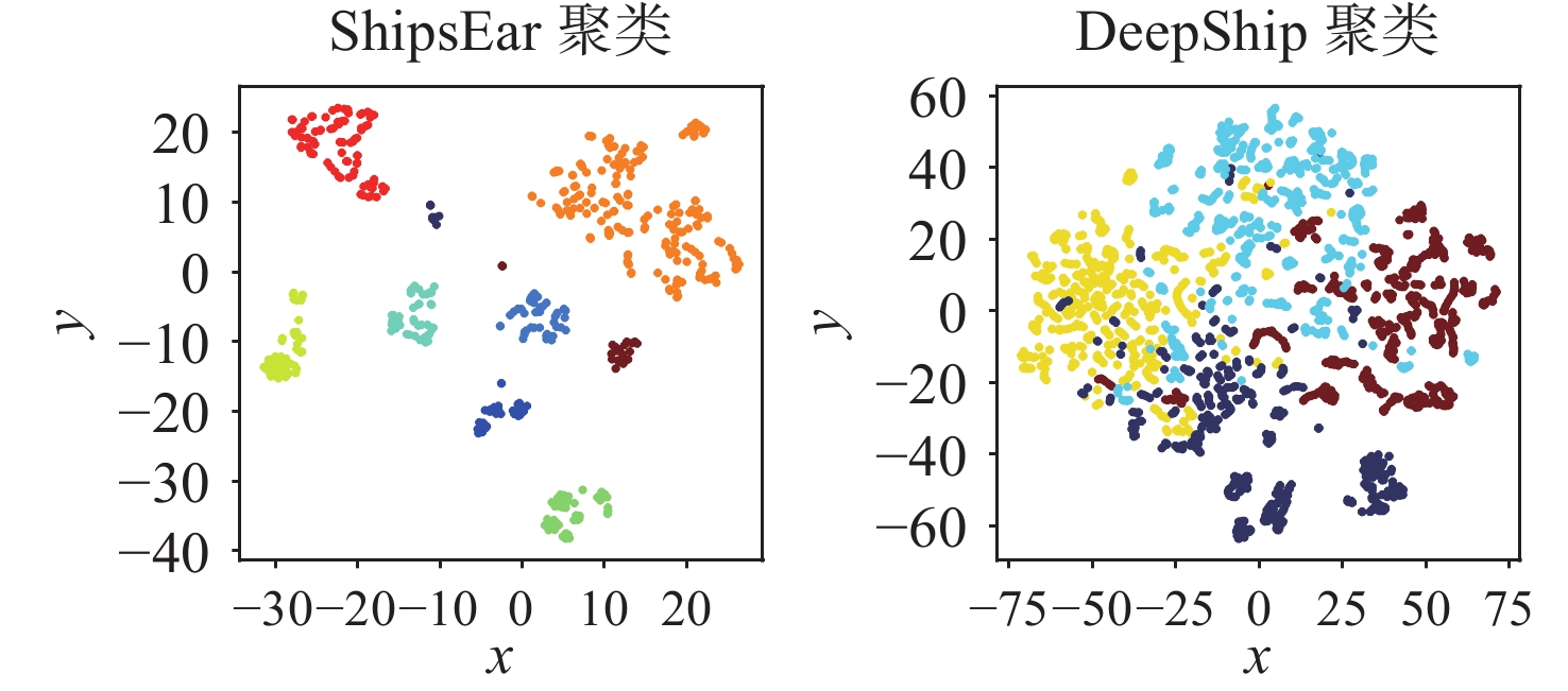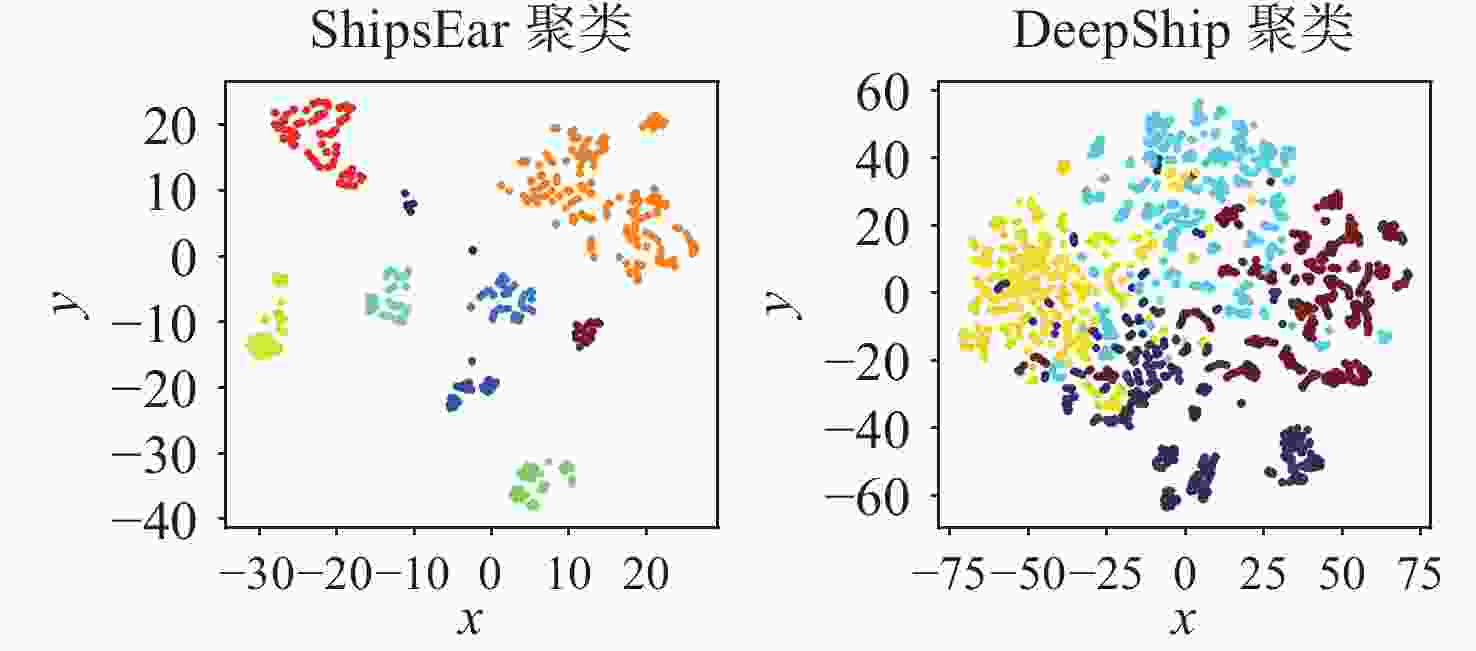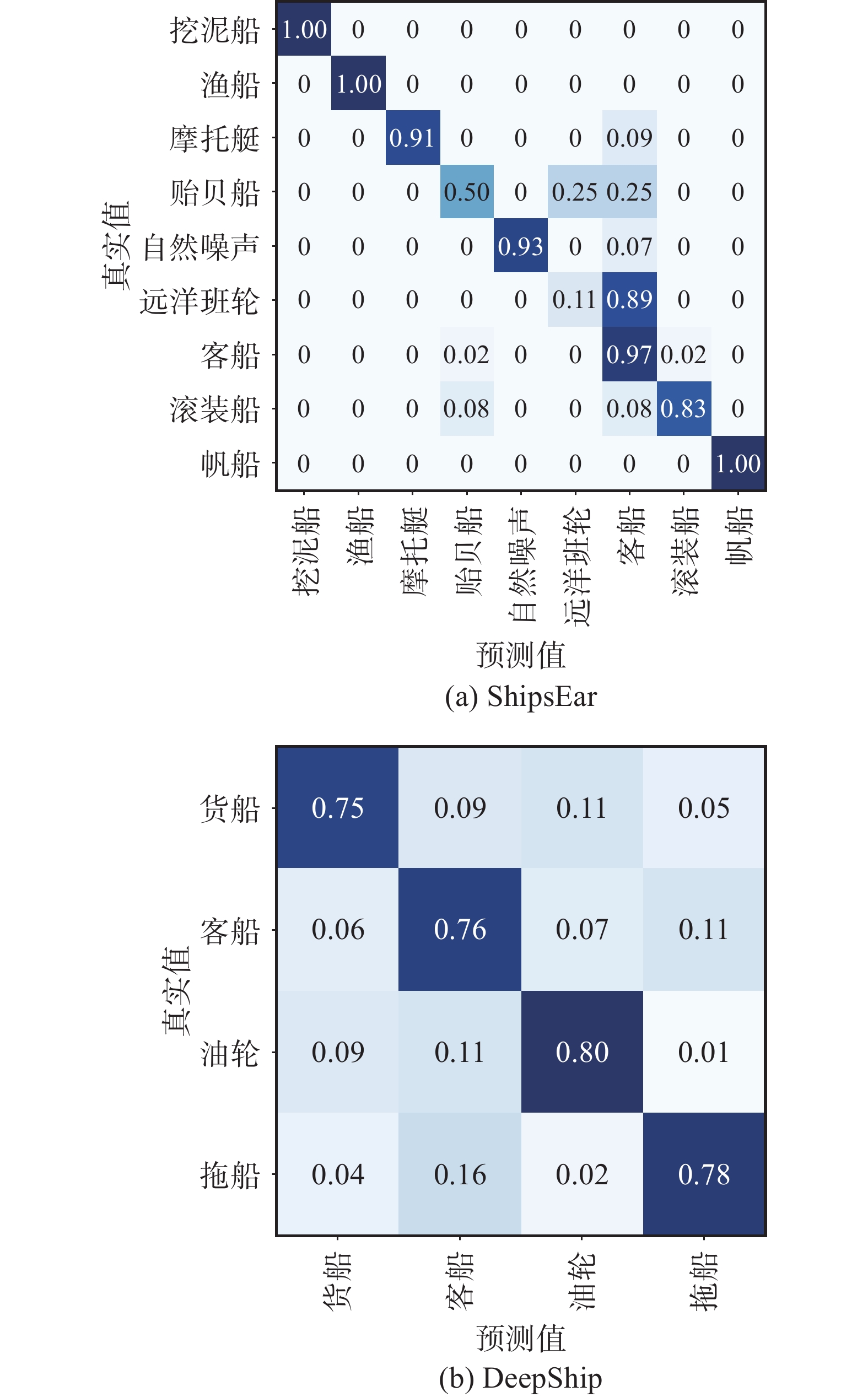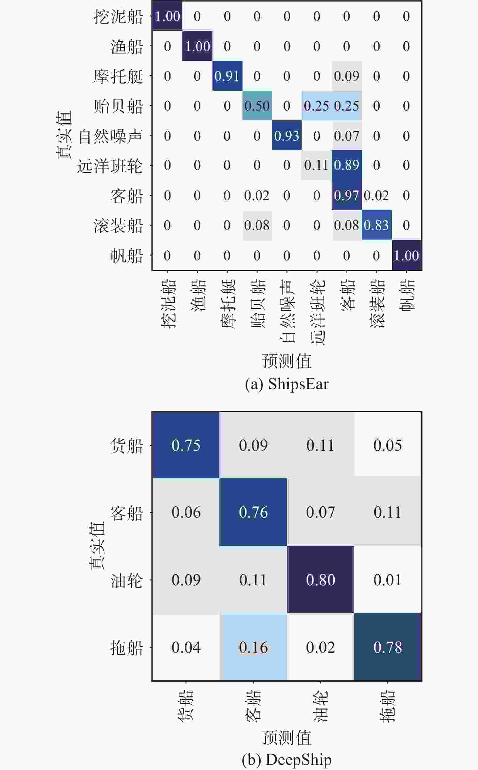 方法 特征 OA/% Params×106 时间/s FLOPs×109 ResNet18 Mel 79.5 11.179 768 4.40 SIR&LMR Mel 83.8 11.841 1 733 13.40 CMoE STFT 85.5 11.191 2 102 55.62 所提方法 Mel 86.3 11.241 824 4.43 表 3 DeepShip数据集对比实验结果
