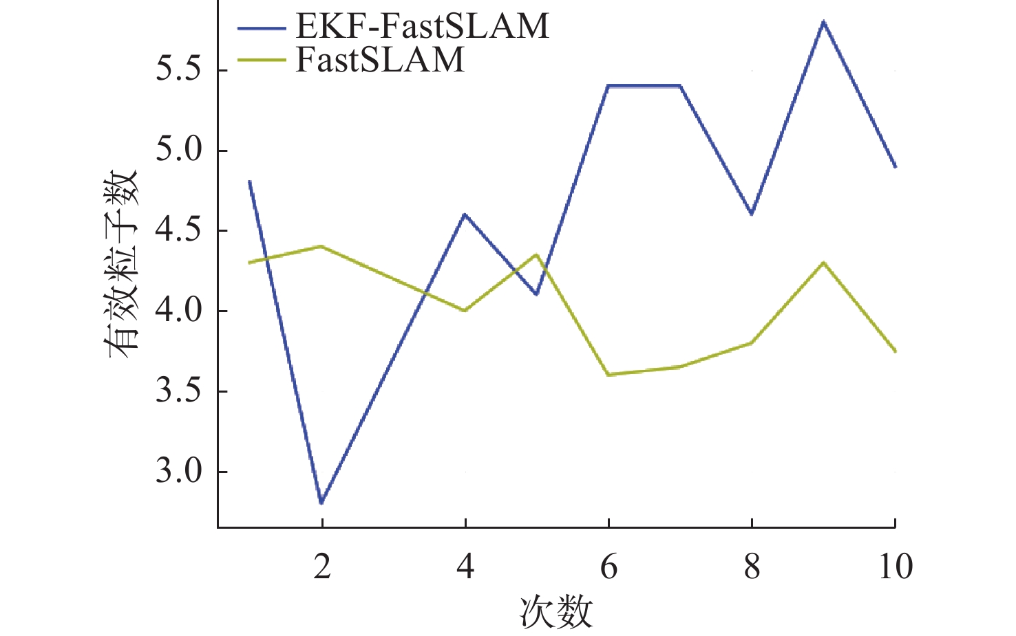 次数 FastSLAM EKF-FastSLAM 1 0.39 1.03 2 0.25 0.96 3 0.31 1.00 4 0.37 0.91 5 0.21 0.96 6 0.28 1.02 7 0.35 0.93 8 0.48 1.05 9 0.36 0.95 10 0.32 0.96 表 2 路径误差
