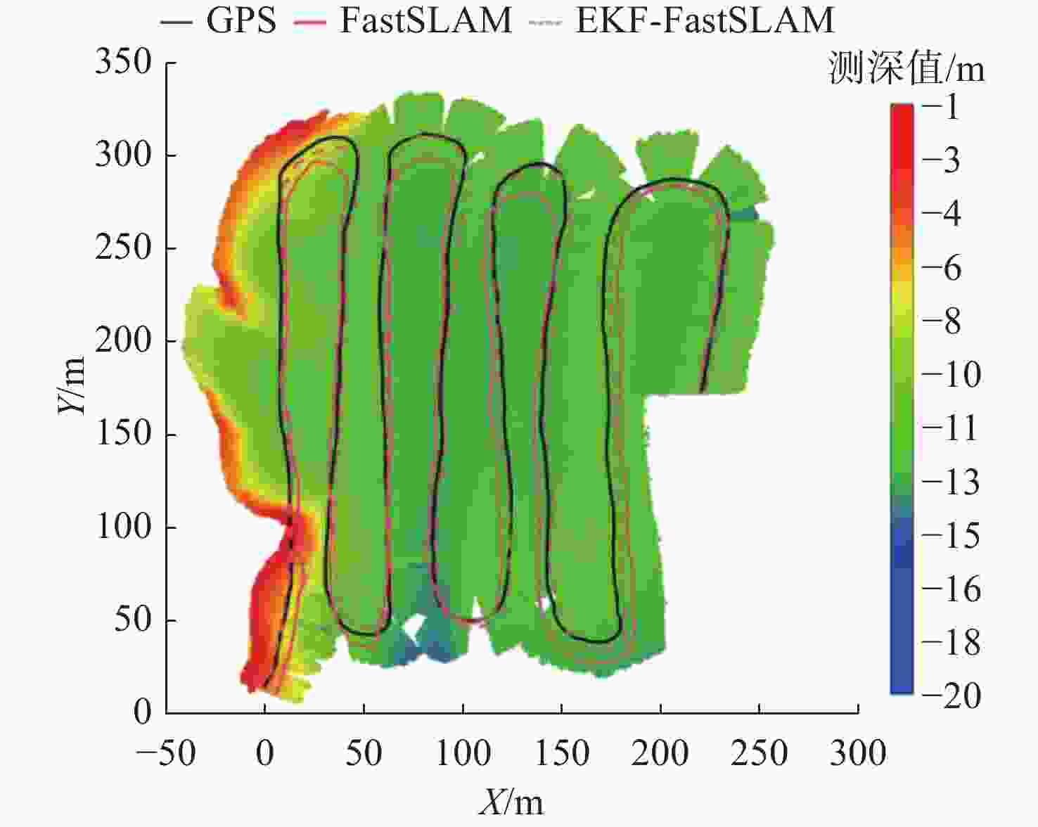 摘要: 随着水下探测技术的发展, 多波束测深声呐(MBES)以其高效测量和高分辨率成为水下地形扫描的关键工具。然而, 在复杂动态水域中, 如何利用声呐数据构建高精度地图仍是一大挑战。针对传统FastSLAM算法在动态环境中易发生粒子退化的问题, 提出了一种基于扩展卡尔曼滤波(EKF)的FastSLAM优化方法, 通过在粒子滤波过程中引入EKF作为建议分布, 有效融合最新观测信息, 减轻粒子退化, 提高滤波器的稳定性和精度。同时, 针对水下测量数据稀疏和重叠不足的情况, 引入高斯过程回归(GPR)进行非线性建模与地图外推, 弥补多波束声呐建图的稀疏性。仿真结果表明, EKF-FastSLAM相较于标准FastSLAM显著减少了轨迹误差, 结合GPR的优化算法进一步提升了地图精度, 湖试试验中实现了米级建图精度。Abstract: With the advancement of underwater exploration technologies, multibeam echo sounders(MBES) have become a key tool for underwater terrain scanning due to their efficient measurement capabilities and high spatial resolution. However, constructing high-precision maps from sonar data in complex and dynamic aquatic environments remains a significant challenge. To address the issue of particle degradation commonly encountered in traditional FastSLAM algorithms under such conditions, this paper proposes an optimized FastSLAM method based on the Extended Kalman Filter(EKF). By incorporating EKF as a proposal distribution within the particle filtering process, the method effectively integrates the latest observation data, mitigates particle degeneration, and enhances the stability and accuracy of the filter. Furthermore, considering the sparsity and lack of overlap in underwater sonar measurements, Gaussian Process Regression(GPR) is introduced to perform nonlinear modeling and map extrapolation, thereby compensating for the discontinuities in MBES-based mapping. Experimental results demonstrate that the proposed EKF-FastSLAM significantly reduces trajectory errors and improves mapping accuracy compared to standard FastSLAM. The integration of GPR further enhances the overall mapping performance. Field experiments conducted in a lake environment confirm that the proposed method achieves meter-level mapping precision.