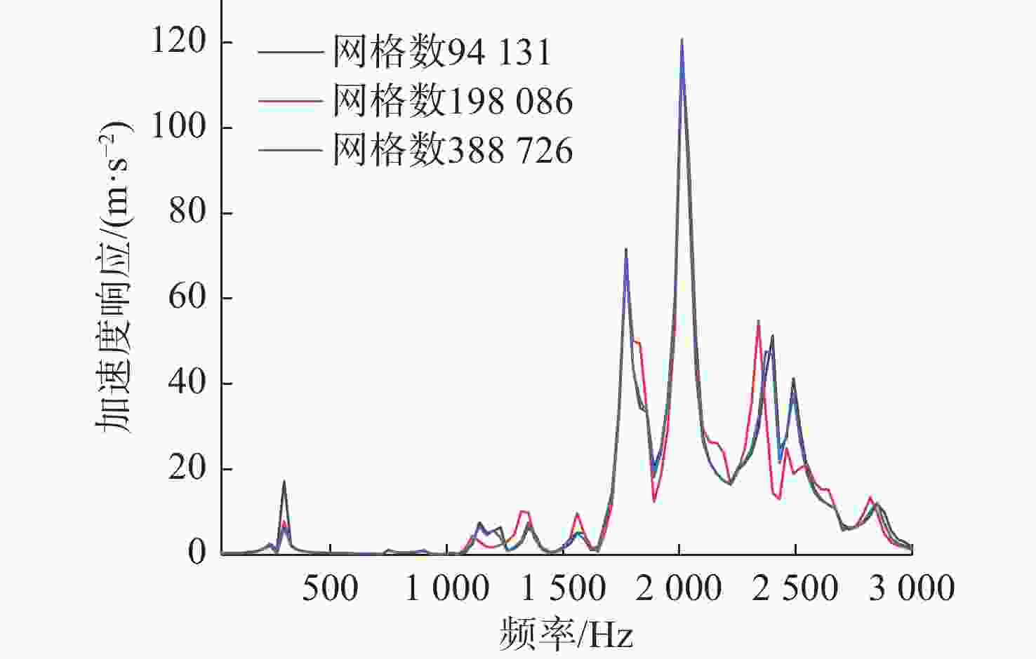 网格单元数 均方根/(m·s−2) 误差/% 94 131 23.92 — 198 086 23.37 2.33 388 726 23.39 0.10 表 2 联轴节与尾轴长度比优化结果