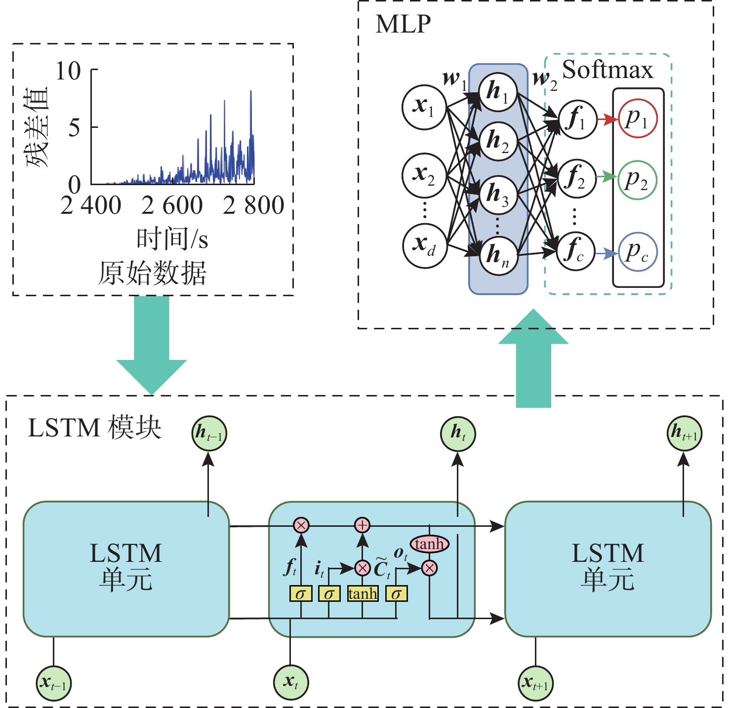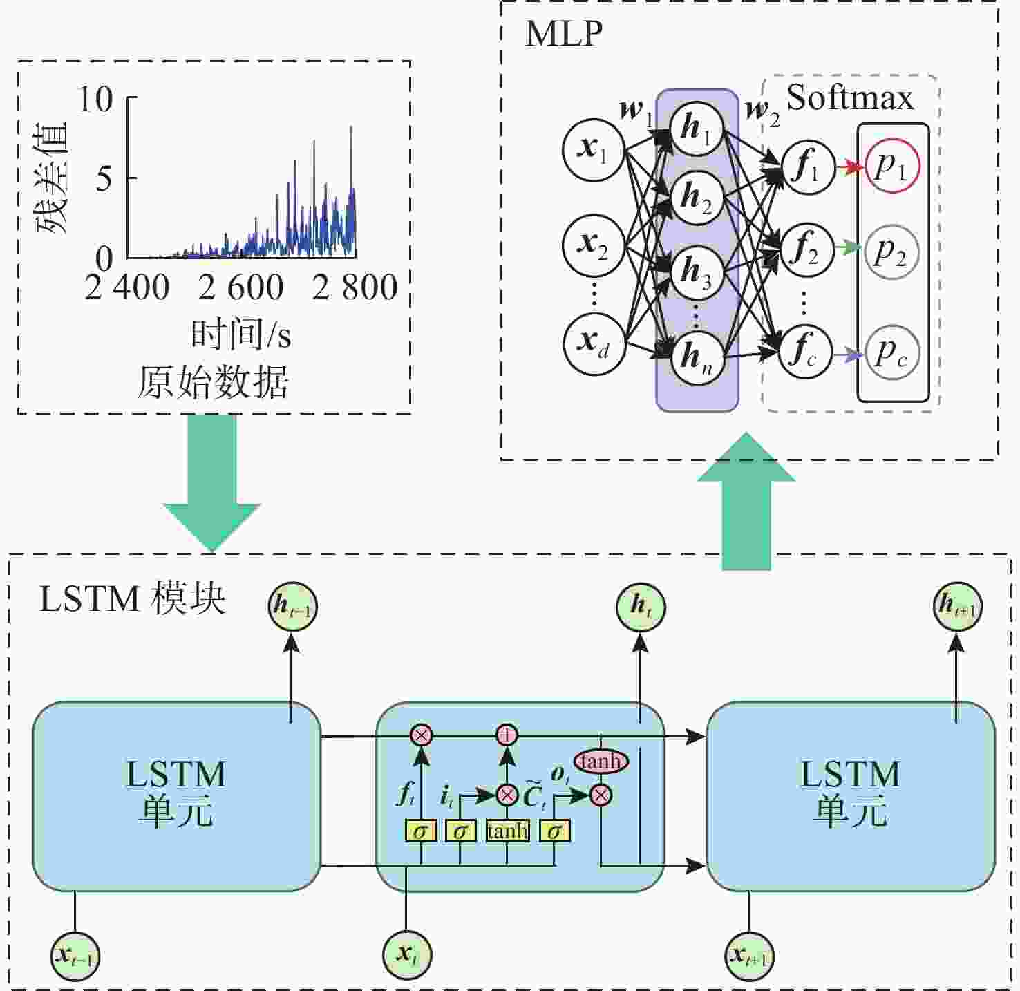 故障类型 数学模型 突变故障 $f(t)=5 r_0 n(t) $ 线性缓变故障 $f(t)=\alpha\left(t-t_0\right) n(t) $ 二次方缓变故障 $ f(t)=\alpha\left(t-t_0\right)^2 n(t) $ 周期性缓变故障 $ f(t)=\alpha \sin \left(t-t_0\right) n(t) $ 对数型缓变故障 $ f(t)=\alpha \ln \left(1+\left(t-t_0\right)\right) n(t) $ 表 2 LSTM模型测试集评价指标