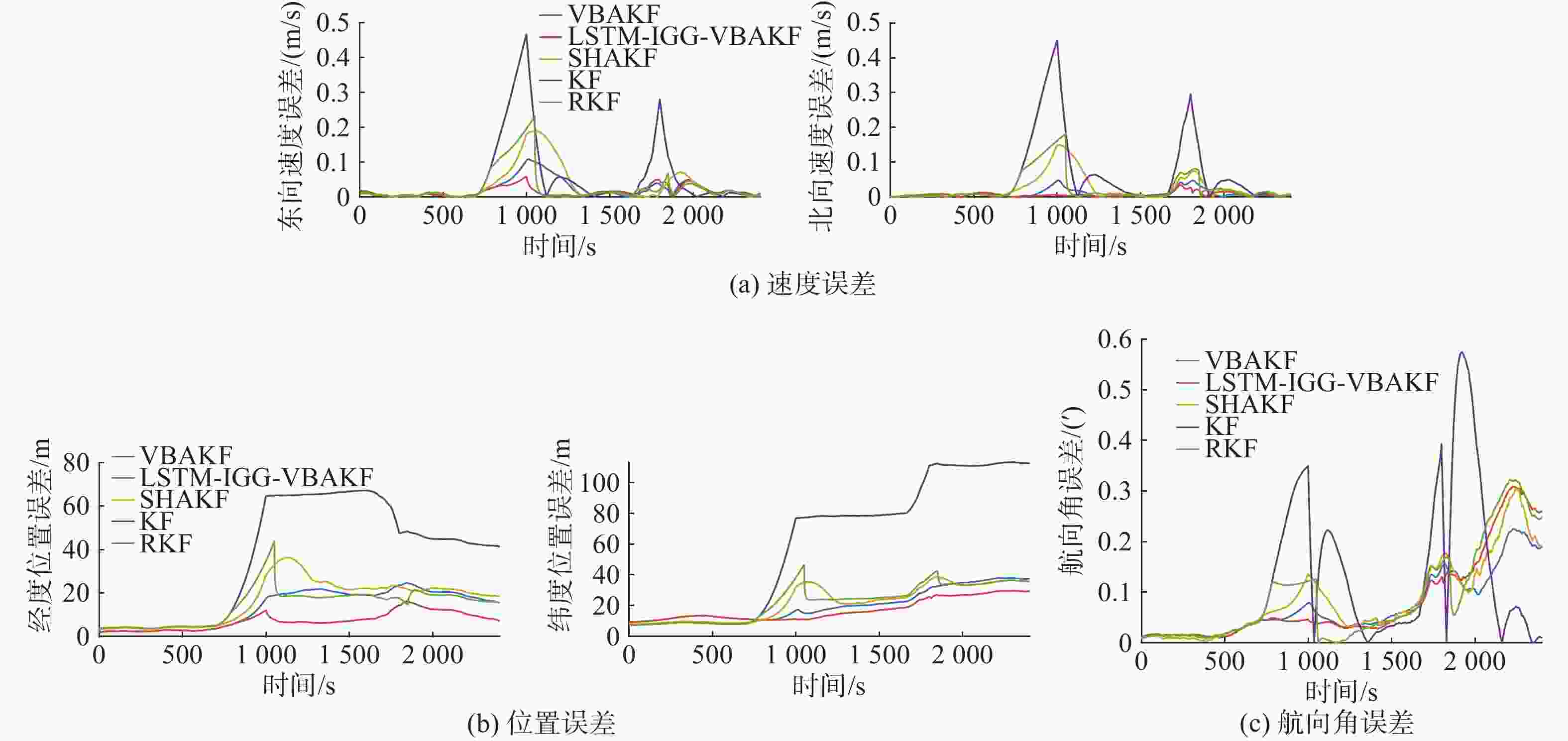 算法 东向速度误差/(m/s) 北向速度误差/(m/s) 经度误差/m 纬度误差/m 航向角误差/(′) KF 0.112 1 0.113 4 44.98 74.34 0.18 RKF 0.054 8 0.048 7 16.55 25.45 0.13 SHAKF 0.060 8 0.044 0 19.44 24.87 0.11 VBAKF 0.035 2 0.015 3 15.86 22.82 0.09 LSTM-IGG-VBAKF 0.021 0 0.009 1 8.17 18.45 0.12 -