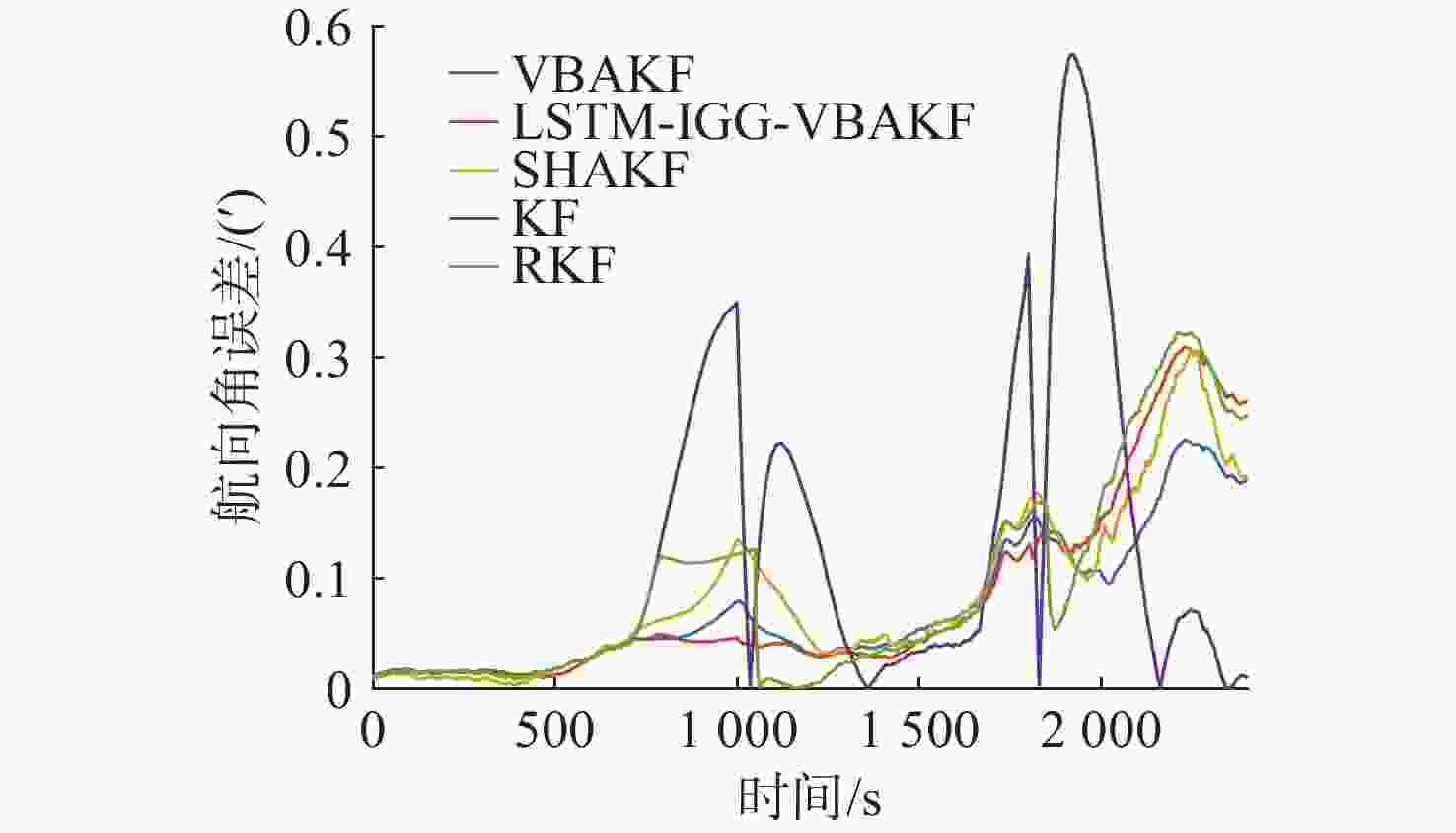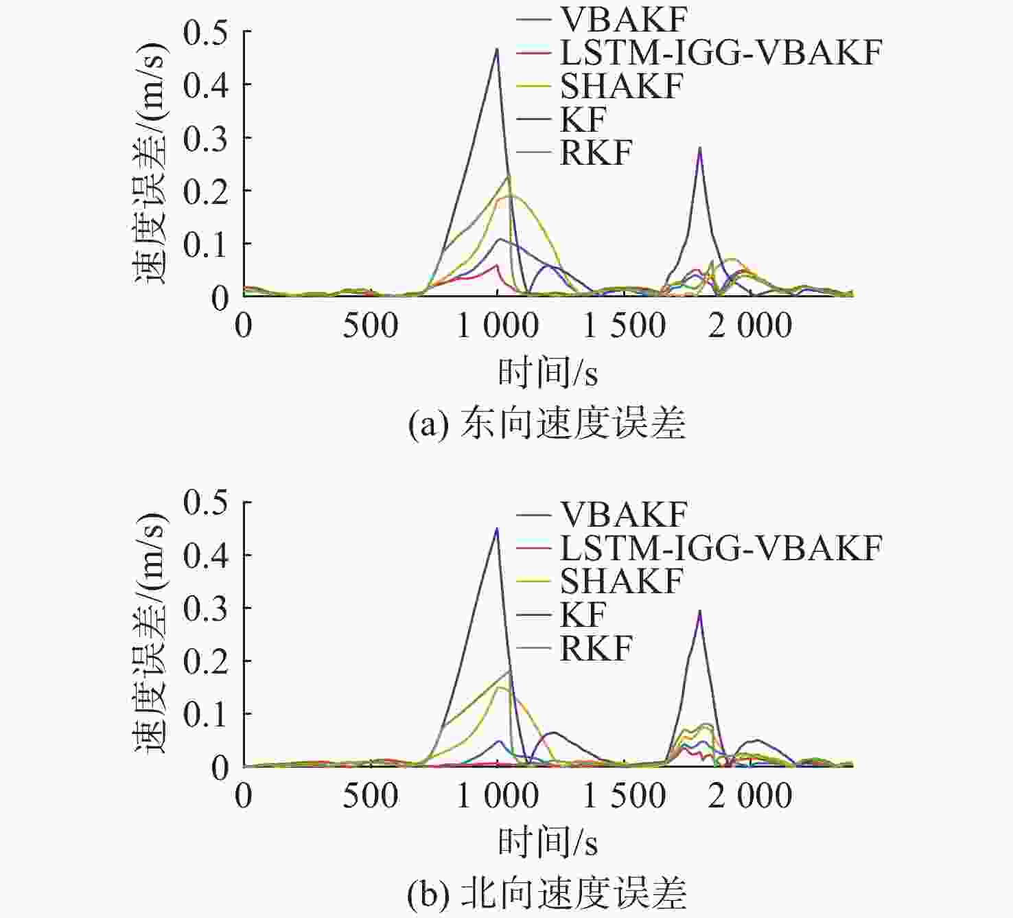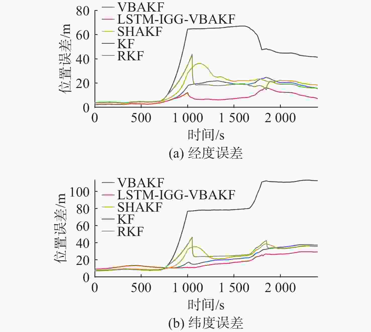 算法 东向速度误差/(m/s) 北向速度误差/(m/s) 经度误差/m 纬度误差/m 航向角误差(′) KF 0.1 121 0.1 134 44.98 74.34 0.18 RKF 0.0 548 0.0 487 16.55 25.45 0.13 SHAKF 0.0 608 0.0 440 19.44 24.87 0.11 VBAKF 0.0 352 0.0 153 15.86 22.82 0.09 LSTM-IGG-VBAKF 0.0 210 0.0 091 8.17 18.45 0.12 -