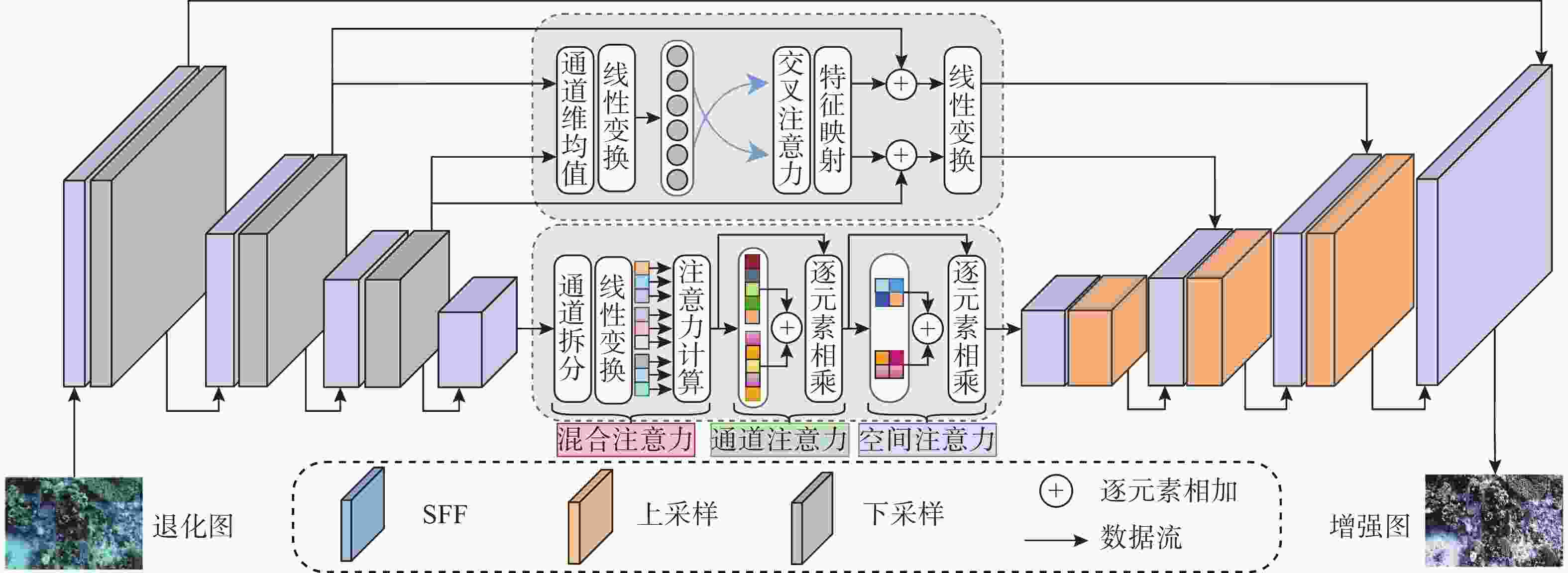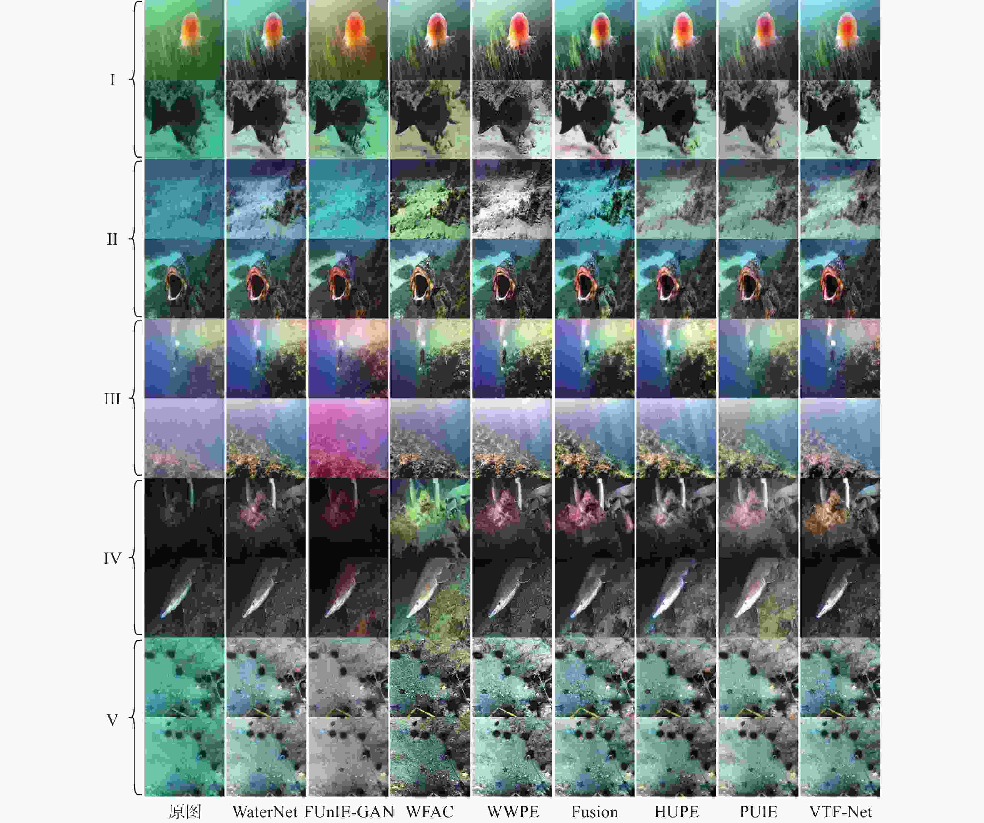 摘要: 水下图像因遭受严重的色彩和结构失真, 影响各种水下视觉任务的表现。现有的水下图像增强方法侧重于改善视觉外观, 忽略优化下游视觉任务的必要性。为此, 文中提出了一种视觉任务友好的水下图像增强方法(VTF-Net)。首先设计了全新的空域频域融合增强模块(SFF), 该模块能大幅提高模型对纹理细节的感知度和图像的保真度; 其次为了实现编码器和解码器之间信息的高效传递, 文中引入多尺度交叉注意力模块(MSCA)和瓶颈注意力模块(BNA), 在保证高效特征提取的基础上增加对全局梯度的感知, 有效改善图像的色偏和模糊问题。最后针对视觉任务友好的理念, 提出一种检测损失函数, 通过引入水下目标检测结果引导模型优化方向。实验结果表明: 文中所提方法在定性和定量实验中均取得了更好的结果, 同时在水下目标检测应用实验中取得了最优的结果。Abstract: Underwater images suffer from severe color and structural distortions, which degrade the performance of various underwater vision tasks. Existing underwater image enhancement methods focus on improving visual appearance while ignoring the necessity of optimizing the downstream vision tasks. To address this issue, this paper proposes a Visual Task-Friendly underwater image enhancement Network(VTF-Net). Specifically, we first design a novel Spatial-Frequency Fusion enhancement module(SFF), which can significantly improve the model’s perception of texture details and image fidelity. Second, to achieve efficient information transmission between the encoder and decoder, we introduce a Multi-Scale Cross-Attention module(MSCA) and a Bottleneck Attention module(BNA), which enhance the perception of global gradients while ensuring efficient feature extraction, thereby effectively alleviating color cast and blurring. Finally, in line with the concept of visual task-friendliness, we propose a detection loss function that guides the optimization direction of the model by incorporating underwater object detection results. Experimental results demonstrate that the proposed method achieves superior performance in both qualitative and quantitative evaluations, and obtains the best result in the application experiment of underwater object detection.