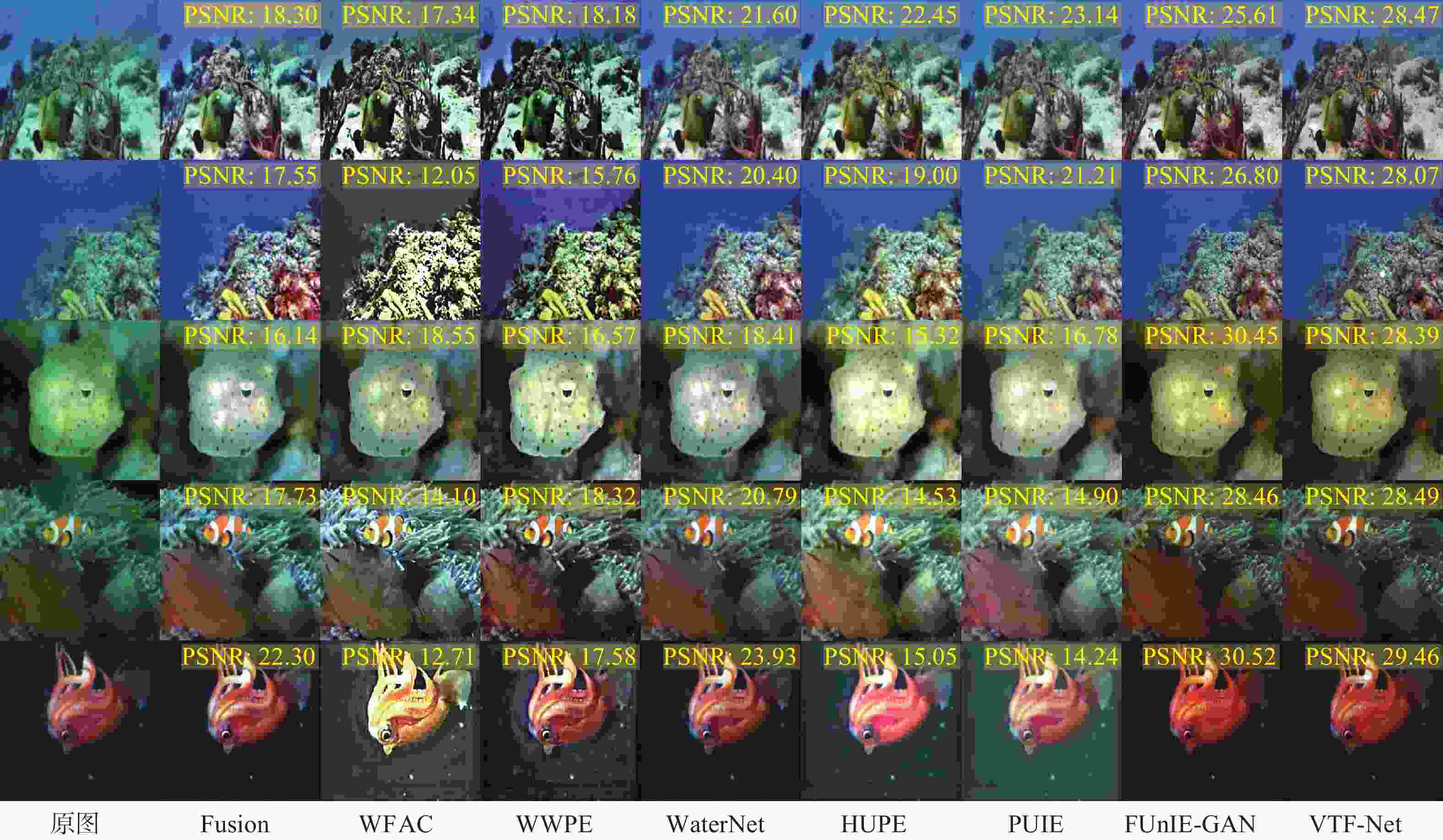 UFO120 EUVP515 参数量×106 单帧耗时/s PSNR↑ SSIM↑ UIQM↑ UCIQE↑ PSNR↑ SSIM↑ UIQM↑ UCIQE↑ Fusion 17.58 0.81 5.10 0.45 17.63 0.81 4.32 0.43 — 0.240 WFAC 15.37 0.68 4.01 0.43 15.65 0.69 3.93 0.43 — 0.359 WWPE 15.64 0.69 4.37 0.45 15.84 0.69 4.15 0.45 — 0.388 WaterNet 19.70 0.86 4.57 0.43 19.68 0.86 4.38 0.44 1.09 0.034 HUPE 18.22 0.83 4.70 0.44 18.07 0.82 4.38 0.44 2.05 1.360 PUIE 19.00 0.84 4.28 0.41 19.10 0.84 4.01 0.40 1.01 0.545 FUnIE-GAN 24.83 0.85 4.64 0.43 23.52 0.85 4.32 0.43 7.02 0.094 VTF-Net 25.32 0.87 4.77 0.45 24.77 0.86 4.33 0.43 6.50 0.164 表 2 各个模块的消融实验结果