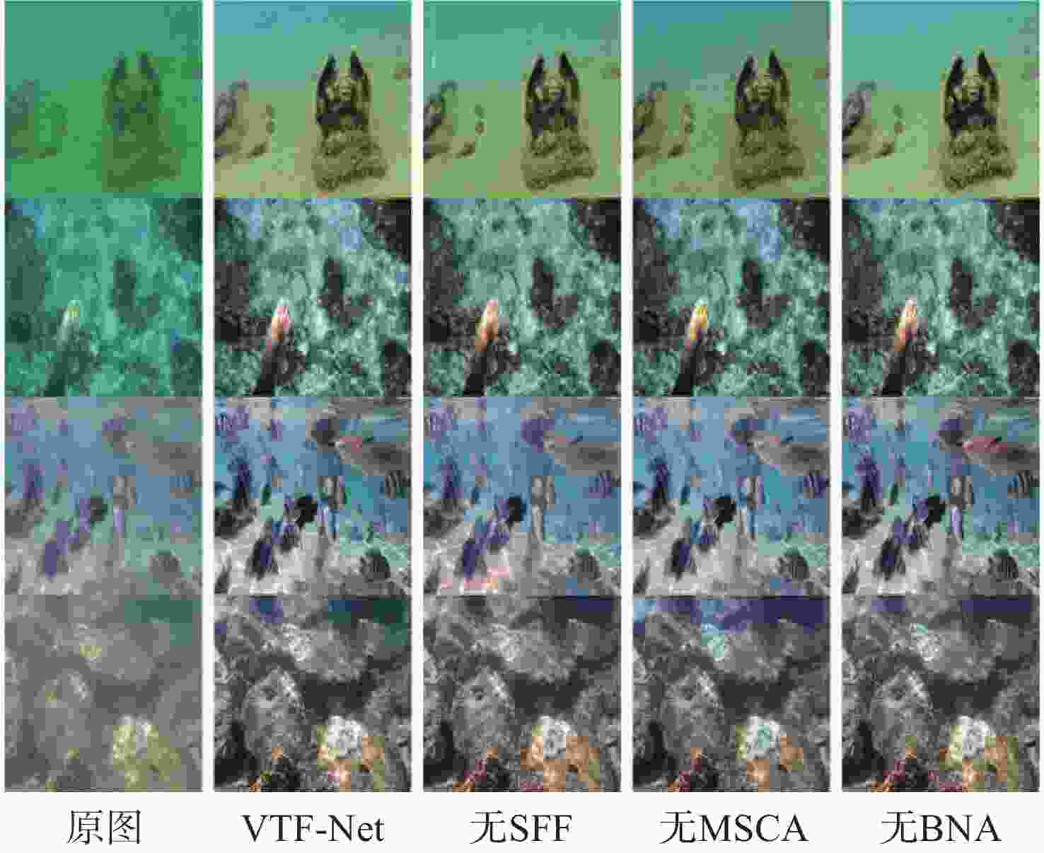 PSNR↑ SSIM↑ UIQM↑ UCIQE↑ VTF-Net 22.819 0.834 4.204 0.396 无SFF 21.540 0.821 4.117 0.367 无MSCA 21.847 0.829 4.177 0.392 无BNA 22.631 0.832 4.089 0.394 表 3 不同算法的检测对比分析