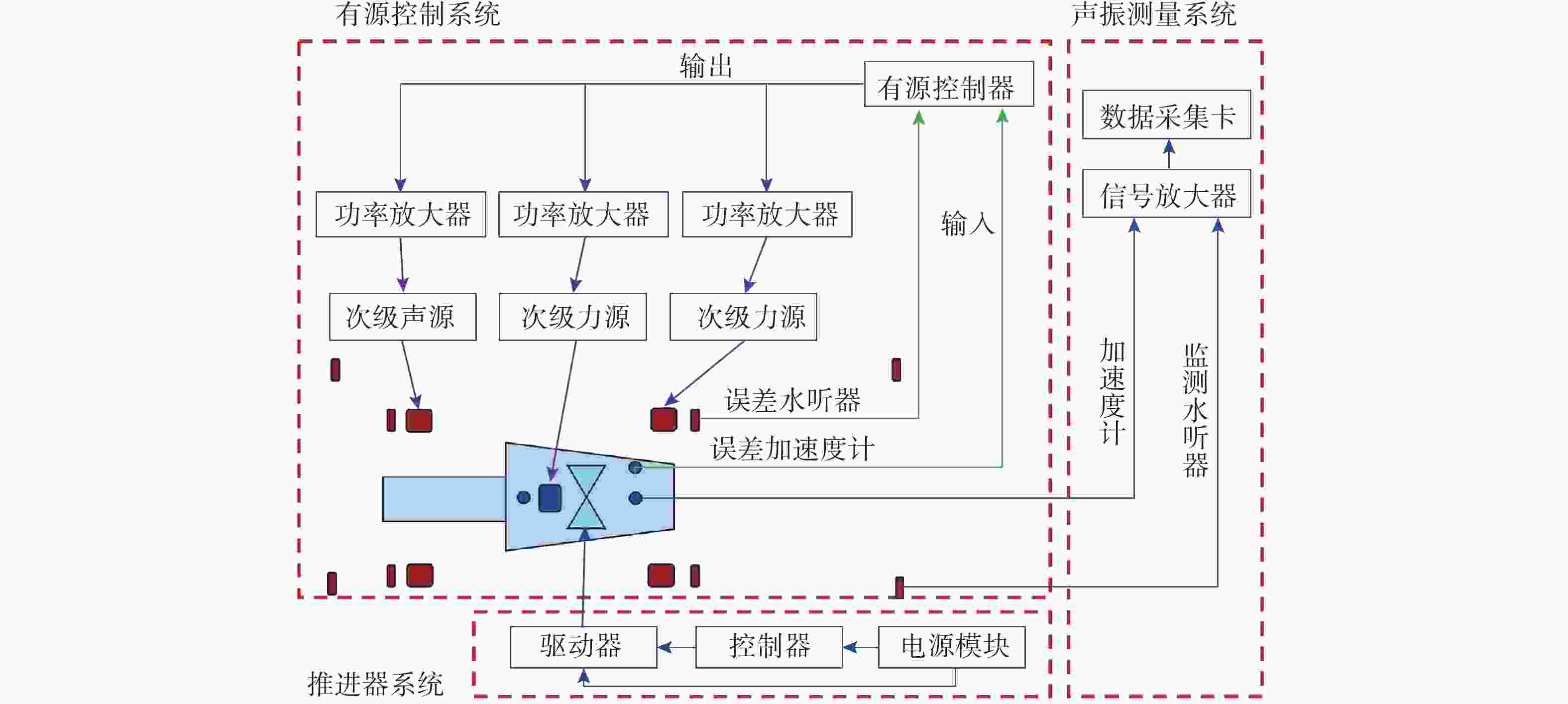 摘要: 水下航行器航行时, 推进器会产生明显的低频线谱辐射噪声。为了验证不同有源控制策略对线谱辐射噪声的控制效果, 首次在实际小型推进器上开展了辐射声场有源控制试验研究。搭建包含推进器、传感器、次级力源、次级声源及控制系统的水下试验平台, 分别进行有源噪声控制、有源振动控制以及有源声振复合控制试验。通过改变推进器工况, 测试不同控制策略对推进器水下辐射噪声的抑制效果。结果表明: 有源噪声控制对推进器低频线谱噪声抑制效果显著且稳定, 在高转速工况下效果最好; 有源振动控制效果具有局限性, 局部控制可能导致声场重构; 有源声振复合控制在部分工况下展现出协同控制潜力, 但需进一步优化控制策略与协同机制。研究成果为水下推进器辐射噪声有源控制的工程化提供了试验依据和技术支撑。Abstract: When an underwater vehicle is in motion, the propeller will generate significant low-frequency line spectrum radiation noise. To verify the control effectiveness of different active control strategies on the line spectrum radiation noise, an active control experiment on the radiation acoustic field was conducted for the first time on a real small-scale propeller. An underwater test platform, which includes a propeller, sensors, secondary force actuators, secondary sound sources, and a control system, was constructed for active noise control(ANC), active vibration control(AVC), and active noise and vibration control(ANVC) tests. By altering the working conditions of the propeller, the suppression effects of different control strategies on the underwater radiated sound pressure of the propeller were tested. The results show that active noise control has a significant and stable effect on suppressing the low-frequency line spectrum noise of the propeller, and performs best under high rotational speed conditions; active vibration control has limitations and local control may lead to sound field reconstruction; active acoustic-vibration combined control shows potential for collaborative control in some operating conditions, but the control strategy and collaborative mechanism need to be further optimized. The research results provide an experimental basis and technical support for the engineering control of underwater propeller radiated noise.